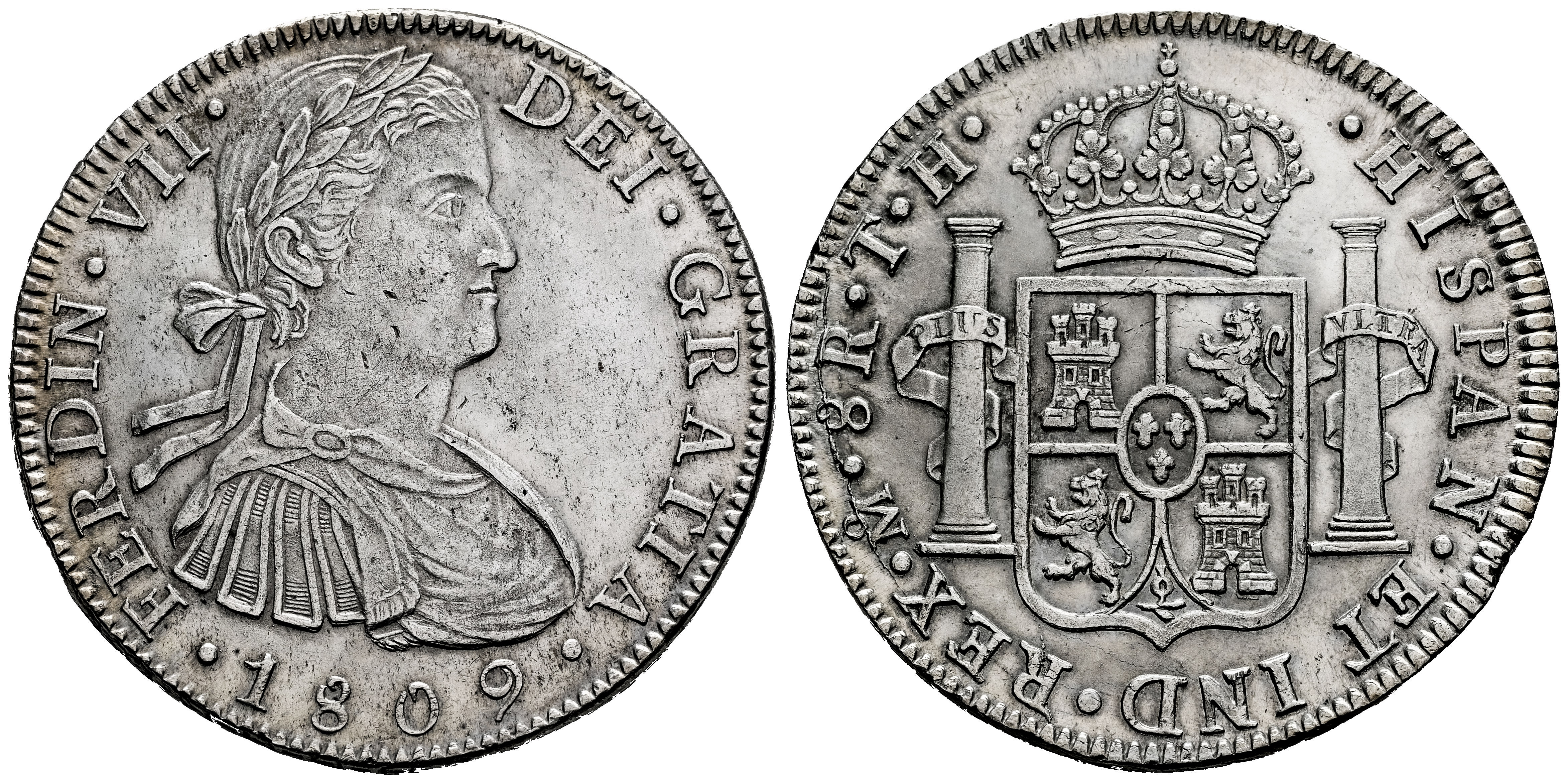 Fernando VII (1808-1833). 8 reales. 1809. México. TH. (Cal-1308). Ag. 26,95 g. Busto imaginario. Restos de brillo original. EBC. Est...400,00.