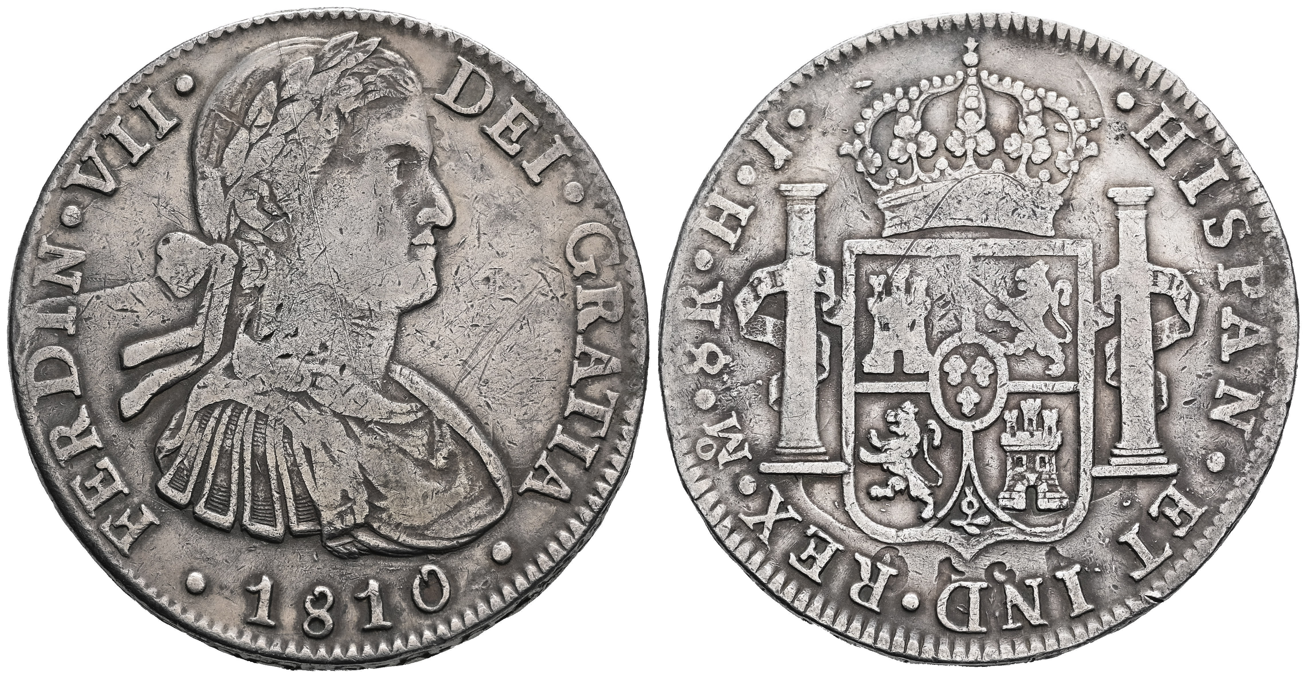 Fernando VII (1808-1833). 8 reales. 1810. México. HJ. (Cal-1314). Ag. 26,63 g. Busto imaginario. Limpiada. MBC-. Est...100,00.