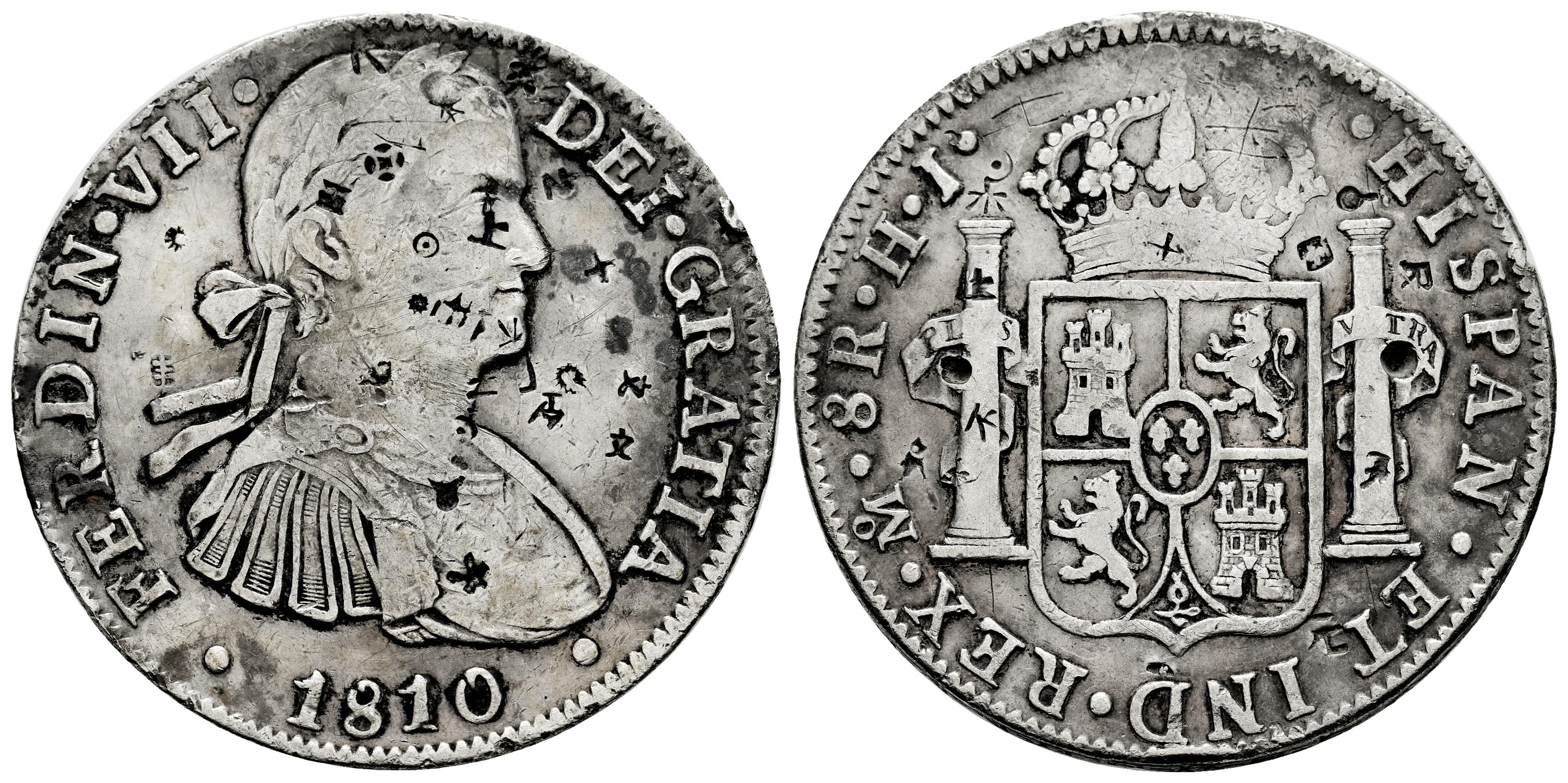 Fernando VII (1808-1833). 8 reales. 1810. México. HJ. (Cal-1314). Ag. 26,61 g. Busto imaginario. Resellos y graffitis orientales. MBC. Est...120,00.