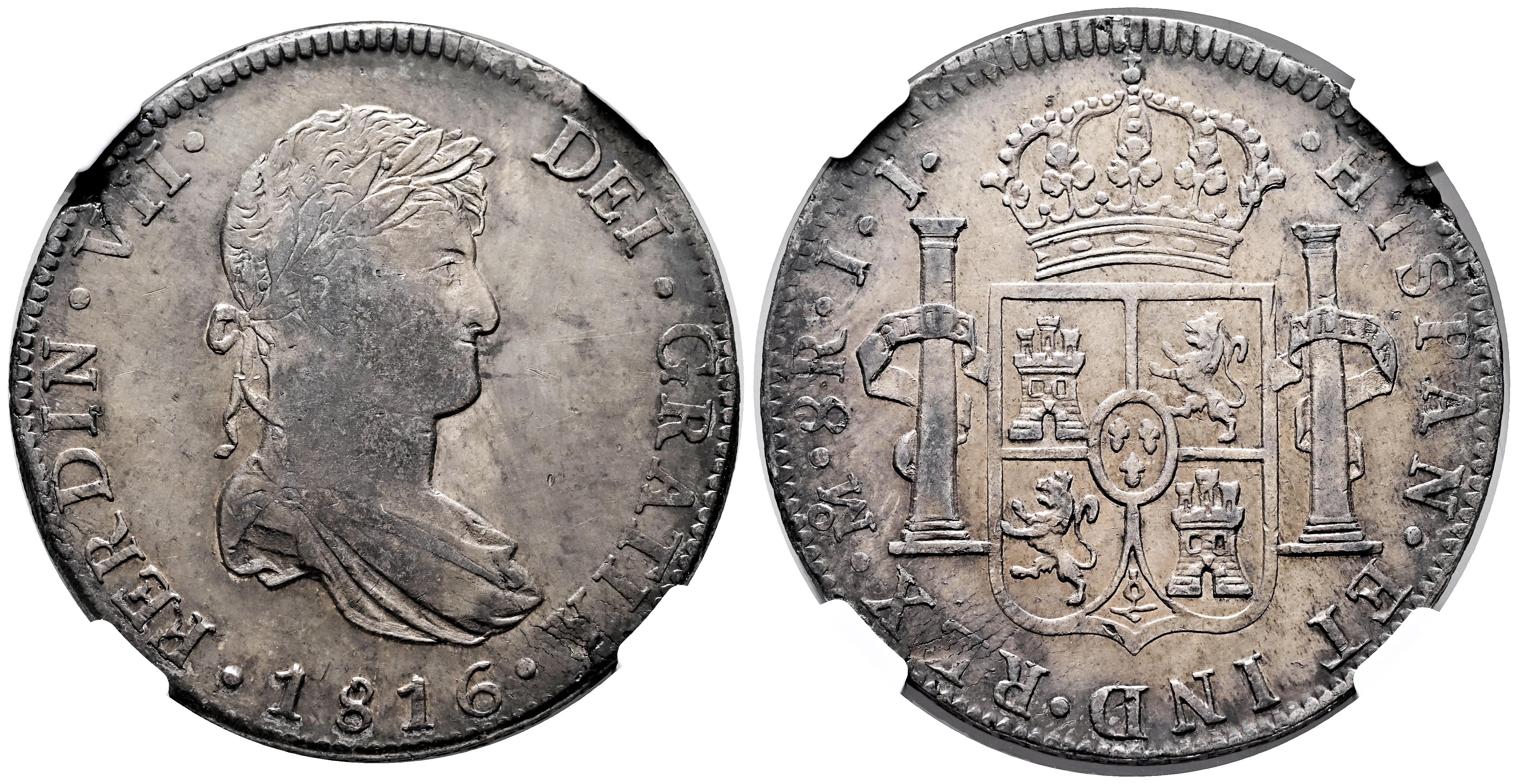 Fernando VII (1808-1833). 8 reales. 1816. México. JJ. (Cal-1331). Ag. Ligera pátina. Encapsulada por NGC como AU 55. Est...200,00.