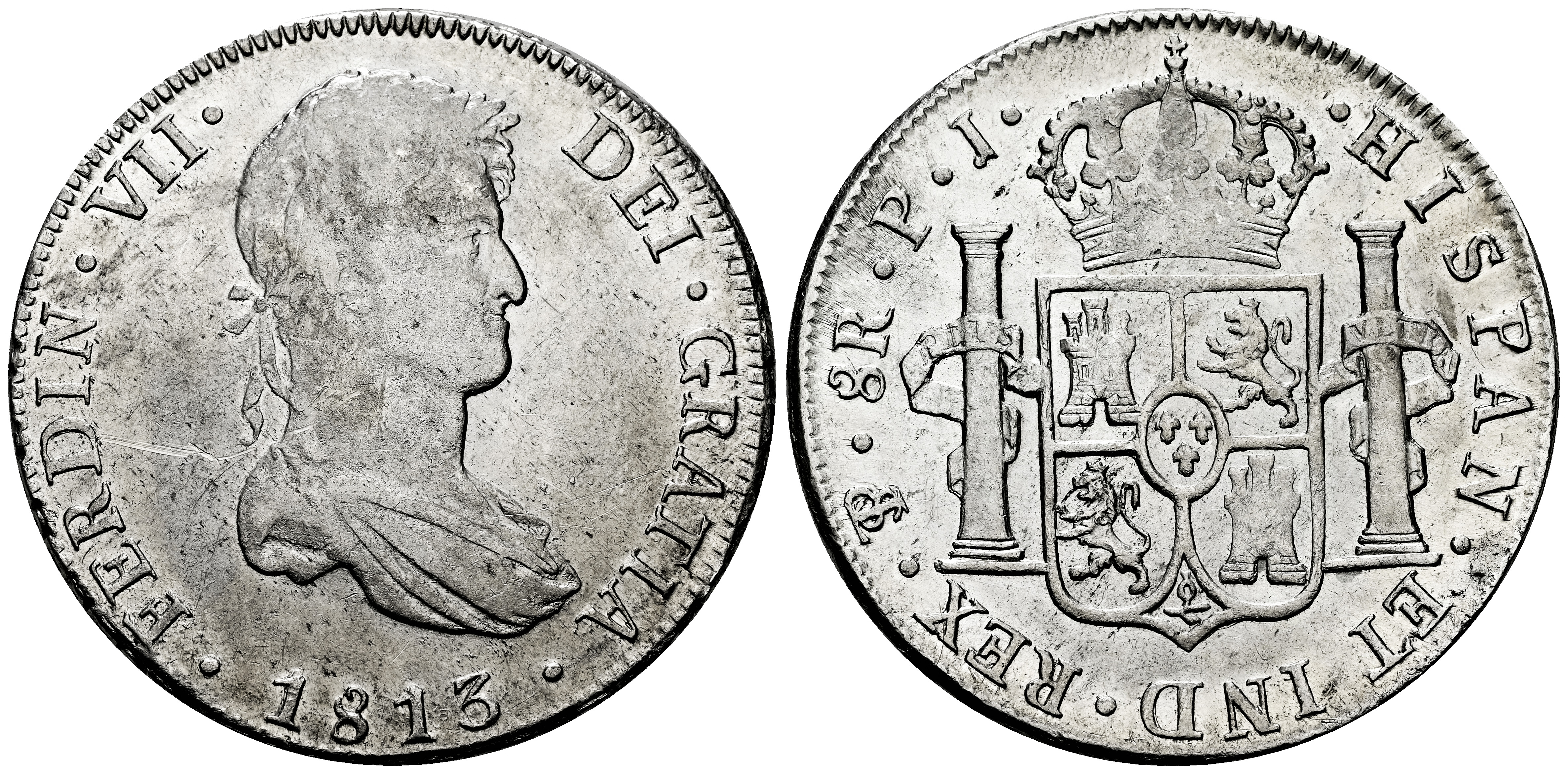 Fernando VII (1808-1833). 8 reales. 1813. Potosí. PJ. (Cal-1375). Ag. 26,79 g. Acuñación floja. Raya en el anverso y leves marquitas. Restos de brillo original. MBC+/EBC-. Est...150,00.
