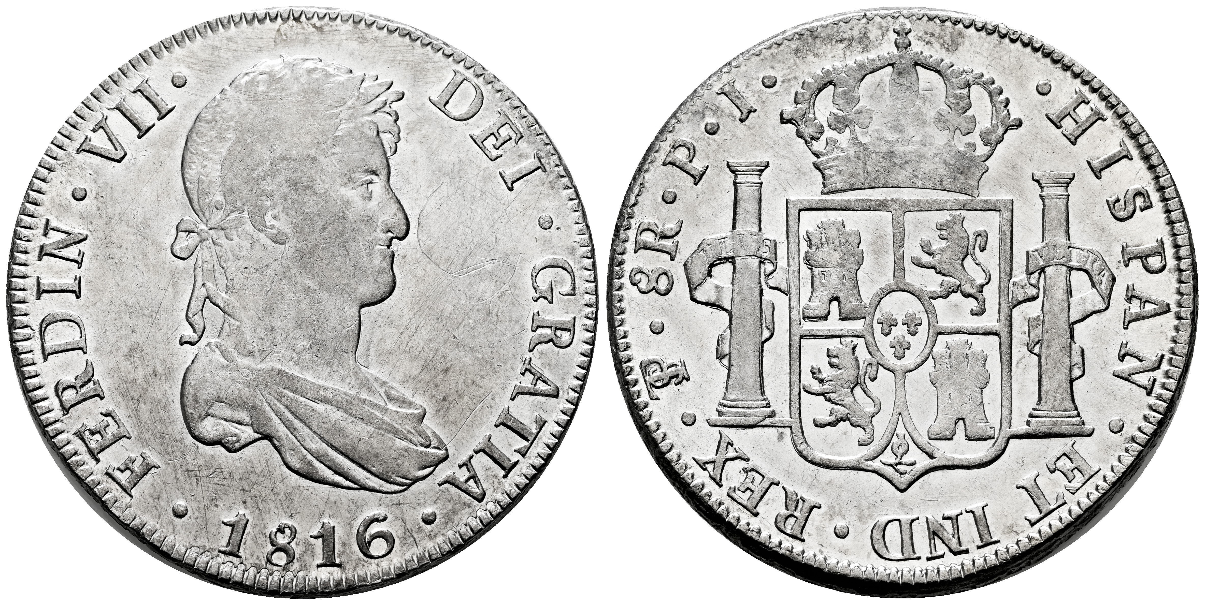 Fernando VII (1808-1833). 8 reales. 1816. Potosí. PJ. (Cal-1380). Ag. 26,88 g. Acuñación floja. Graffiti en anverso. Restos de brillo original. MBC+. Est...150,00.