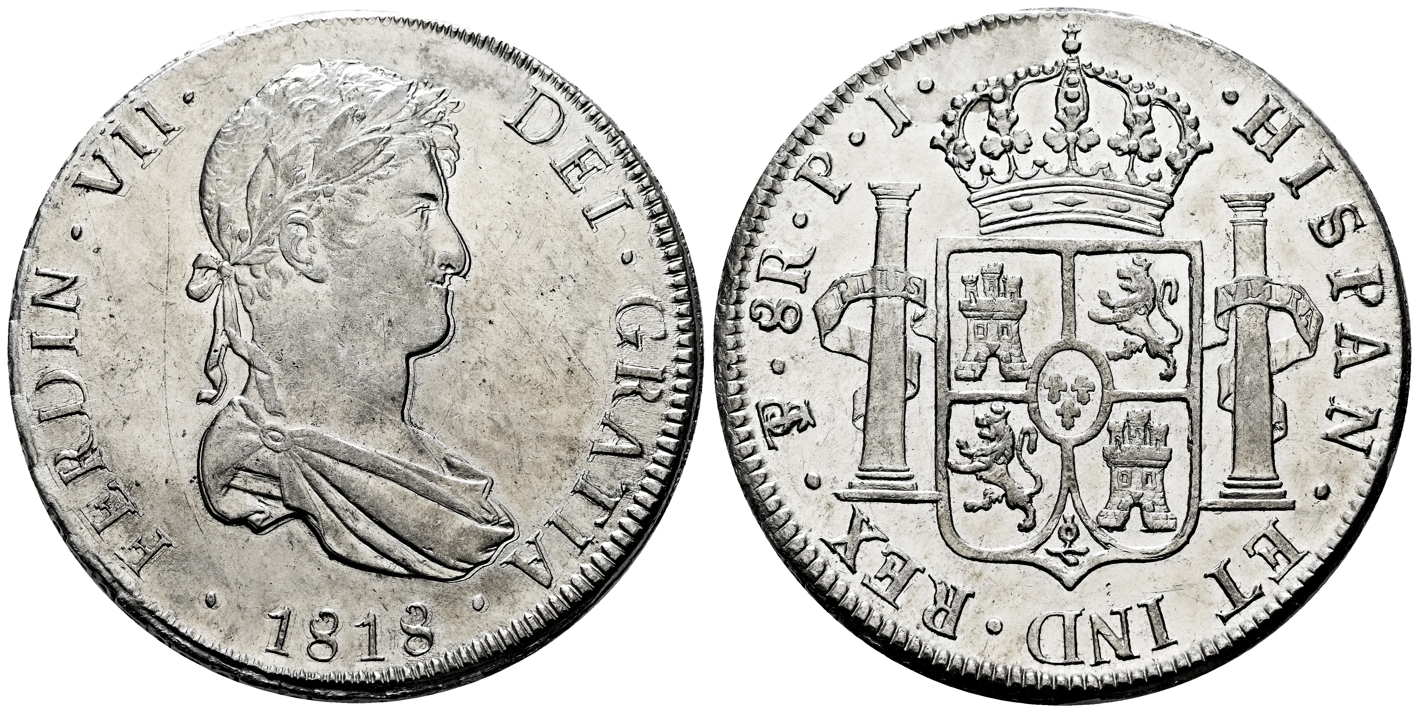 Fernando VII (1808-1833). 8 reales. 1818. Potosí. PJ. (Cal-1382). Ag. 27,02 g. Hojitas. Rayitas. Brillo original. EBC-/EBC. Est...180,00.