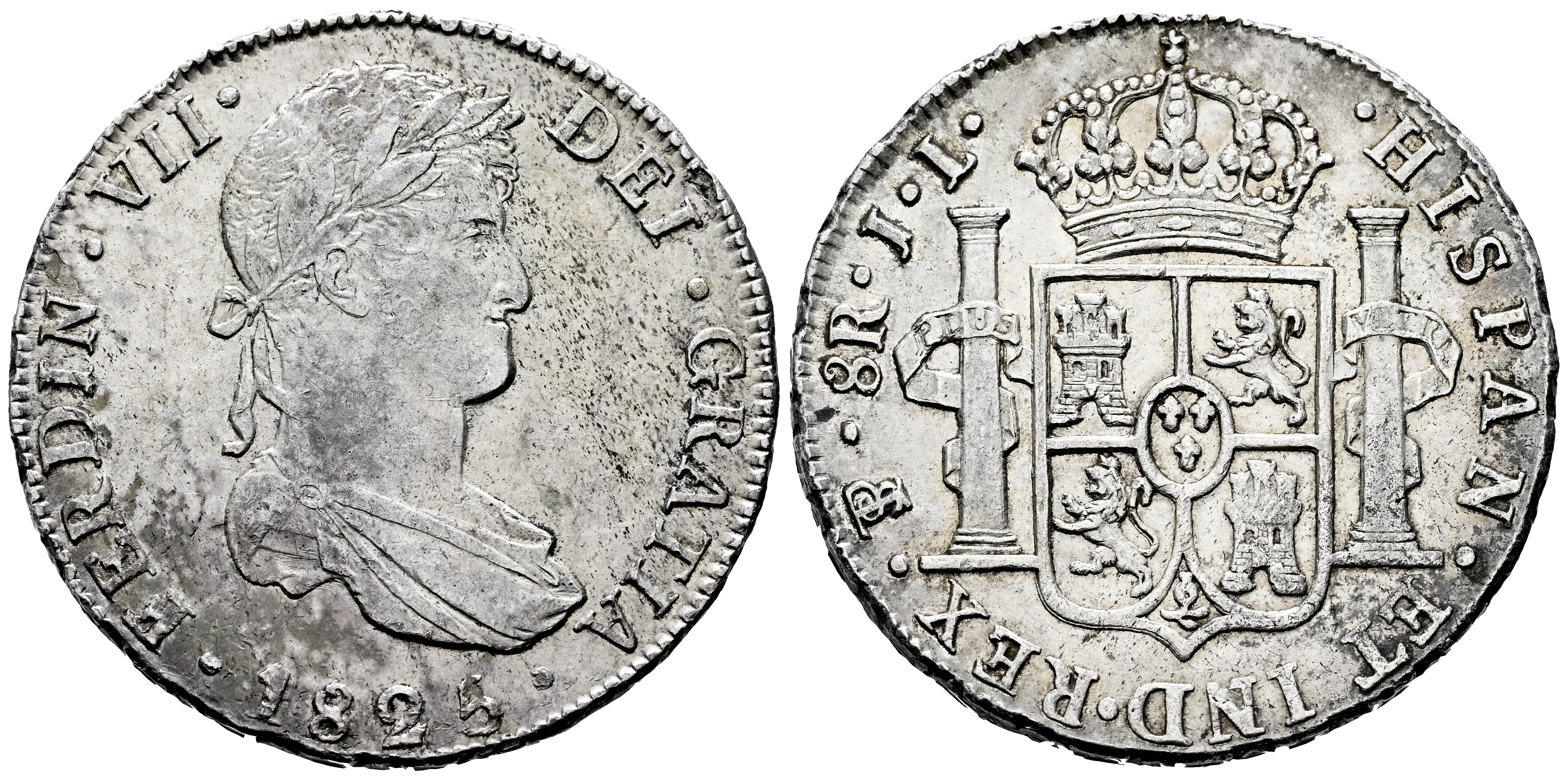 Fernando VII (1808-1833). 8 reales. 1825. Potosí. JL. (Cal-1394). Ag. 27,11 g. Suave pátina. Restos de brillo original. EBC-. Est...200,00.