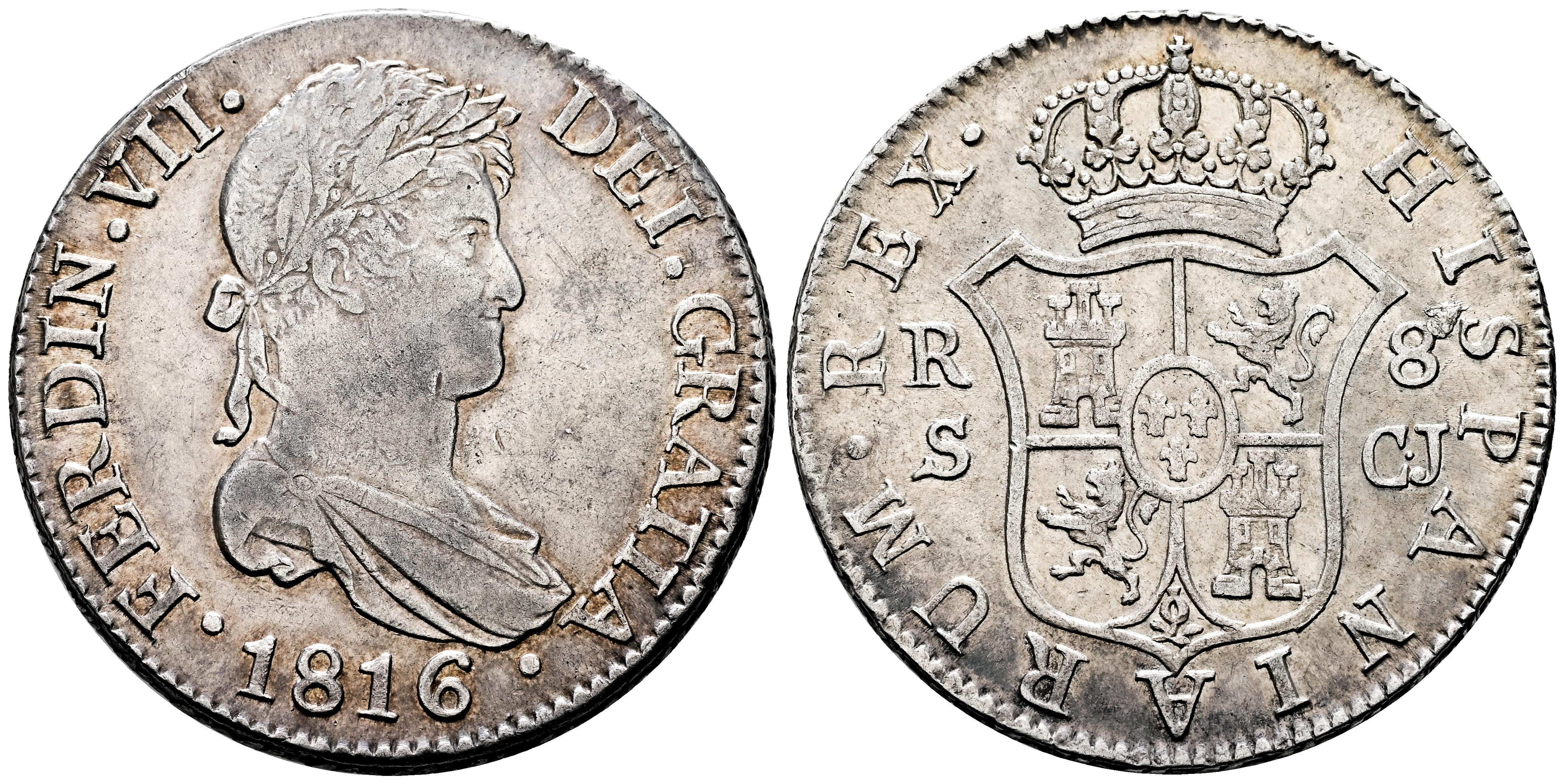 Fernando VII (1808-1833). 8 reales. 1816. Sevilla. CJ. (Cal-1417). Ag. 27,00 g. Suave tono. Escasa. Ex Jesús Vico, diciembre 2005, lote 1936. Ex Colección José Octavio Busto. Conserva etiqueta del coleccionista. MBC+/EBC. Est...250,00.