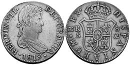 Fernando VII (1808-1833). 8 reales. 1819. Sevilla. CJ. (Cal-1420). Ag. 27,23 g. Suave pátina. Ex Áureo (04/07/2006), lote 498. Ex Colección José Octavio Busto. Conserva etiqueta del coleccionista. MBC+. Est...250,00.