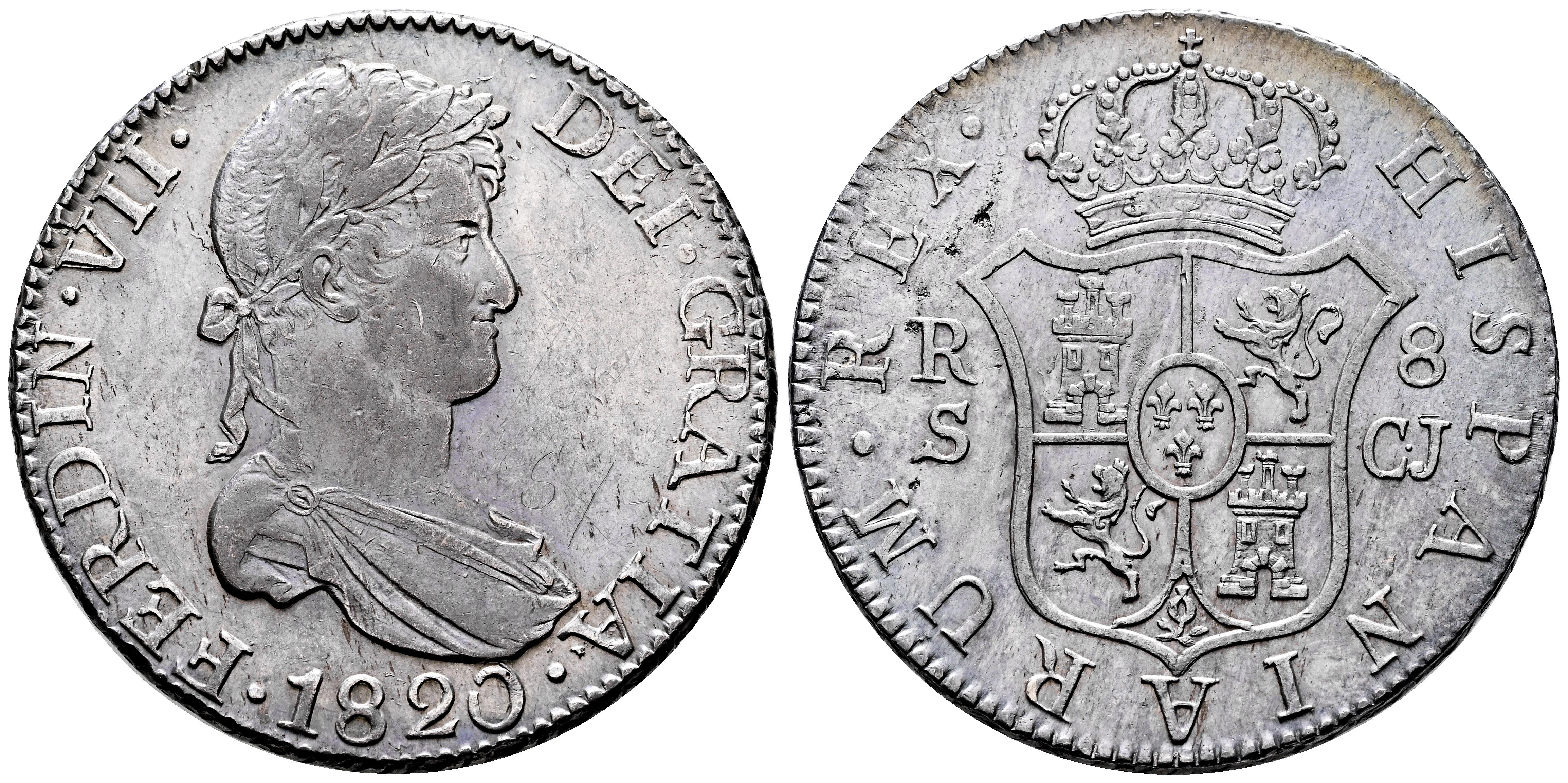 Fernando VII (1808-1833). 8 reales. 1820. Sevilla. CJ. (Cal-1421). Ag. 26,75 g. Suave pátina. Leves rayitas y golpecitos. Escasa. MBC+. Est...220,00.