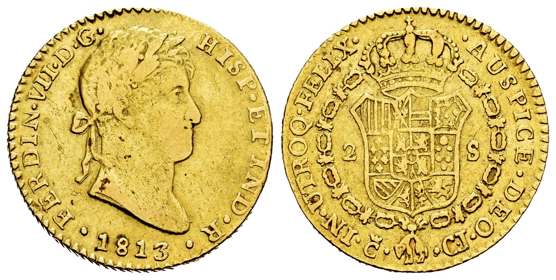 Fernando VII (1808-1833). 2 escudos. 1813. Cádiz. CJ. (Cal-1583). Au. 6,67 g. Marca de ceca pequeña. Limpiada. MBC-. Est...600,00.