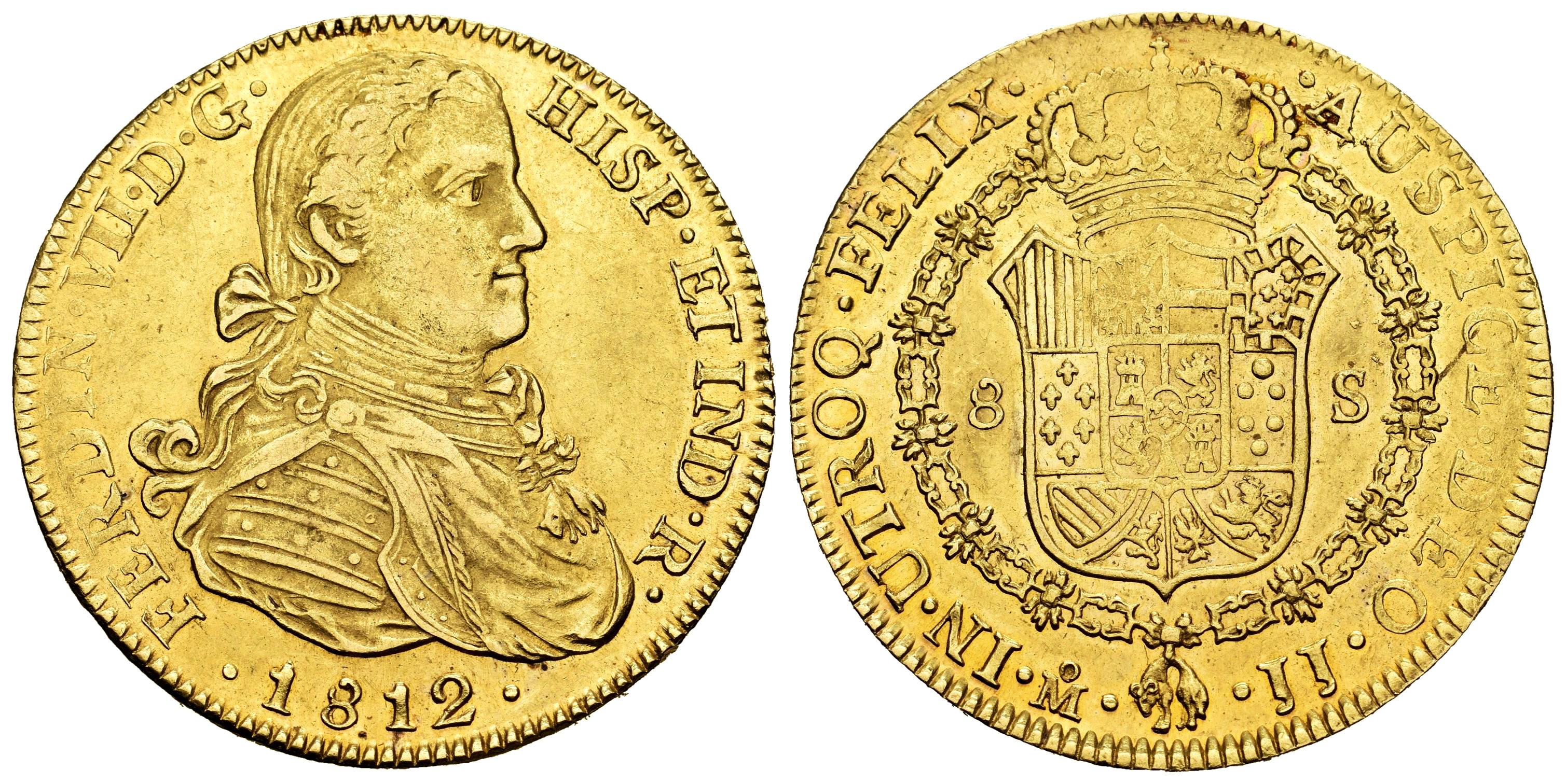 Fernando VII (1808-1833). 8 escudos. 1812. México. JJ. (Cal-1787). (Cal onza-1260). Au. 27,06 g. Busto imaginario. Suaves rayitas. Restos de brillo original. Escasa. EBC-. Est...3200,00.