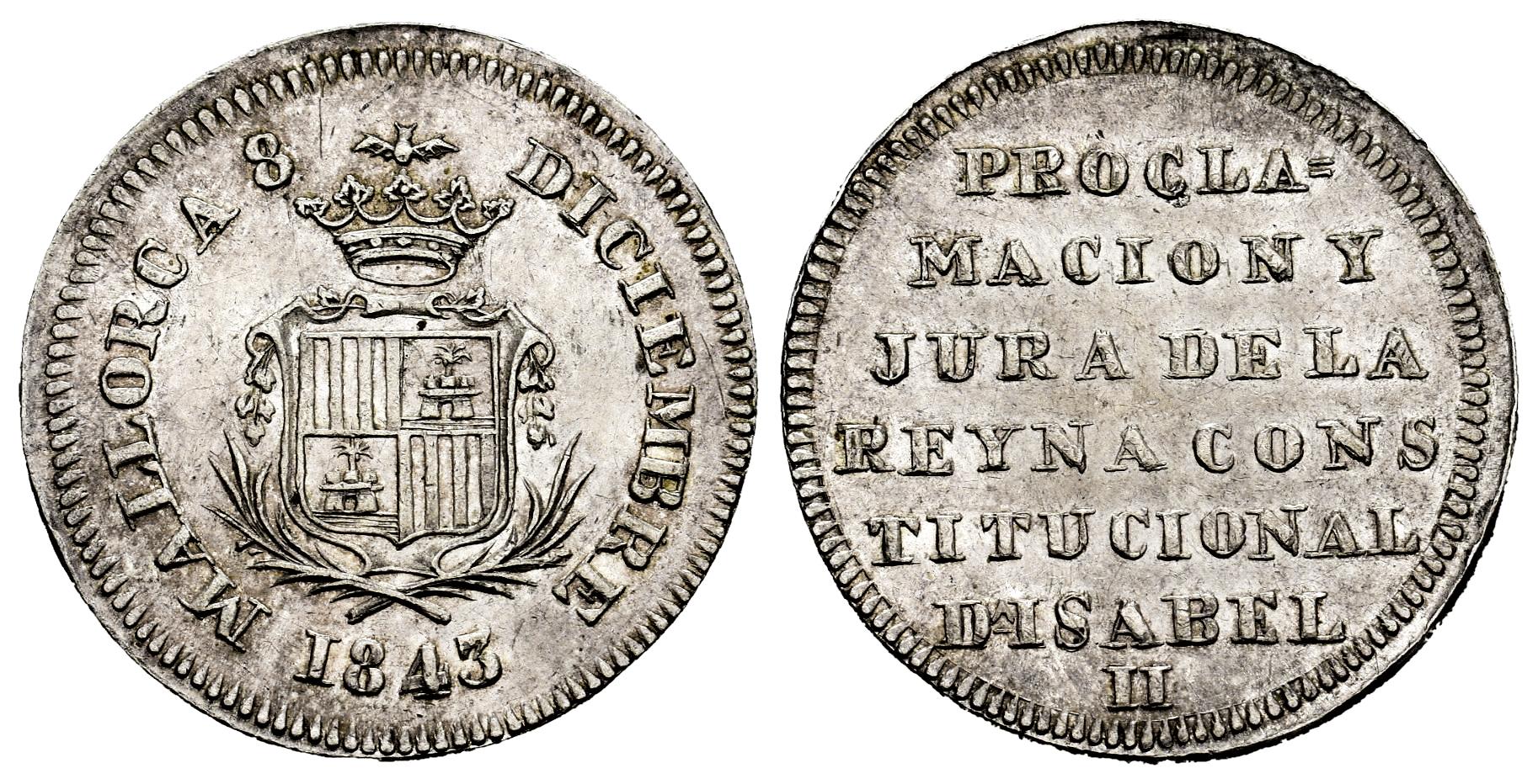 Isabel II (1833-1868). Medalla de mayoría de edad. 1843. Palma de Mallorca. (Herrera-11). (Vives-789). (Vq-13419). Ag. 3,82 g. 22 mm. Grabador: B. O. Carlotta Romey. Brillo original. Escasa así. EBC. Est...120,00.