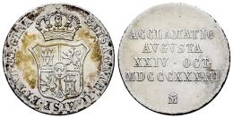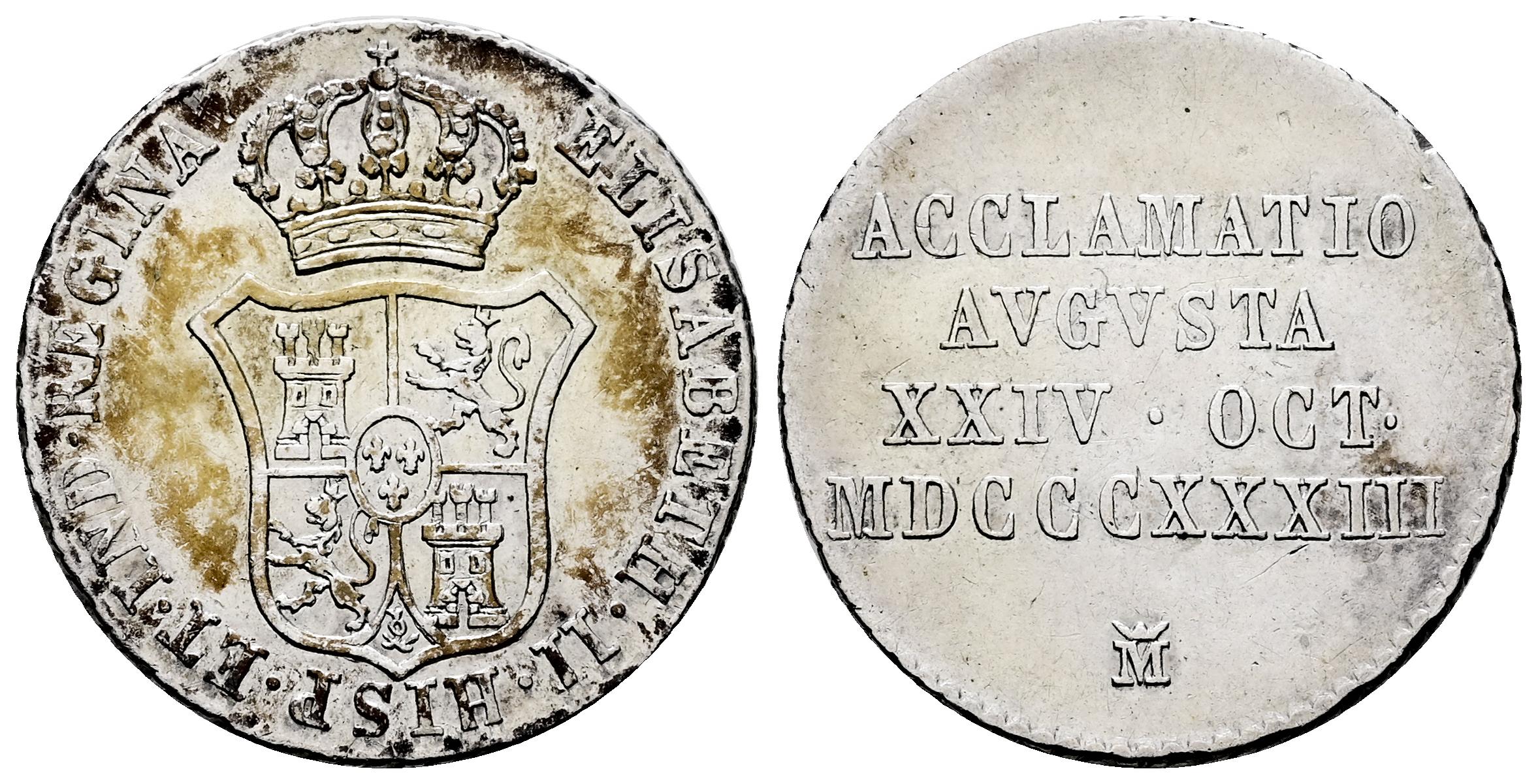 Isabel II (1833-1868). Medalla de proclamación. 1833. Madrid. (Herrera-22). (Vives-571). (Vq-13371). Ag. 2,93 g. Módulo de 1 real. MBC+. Est...25,00.