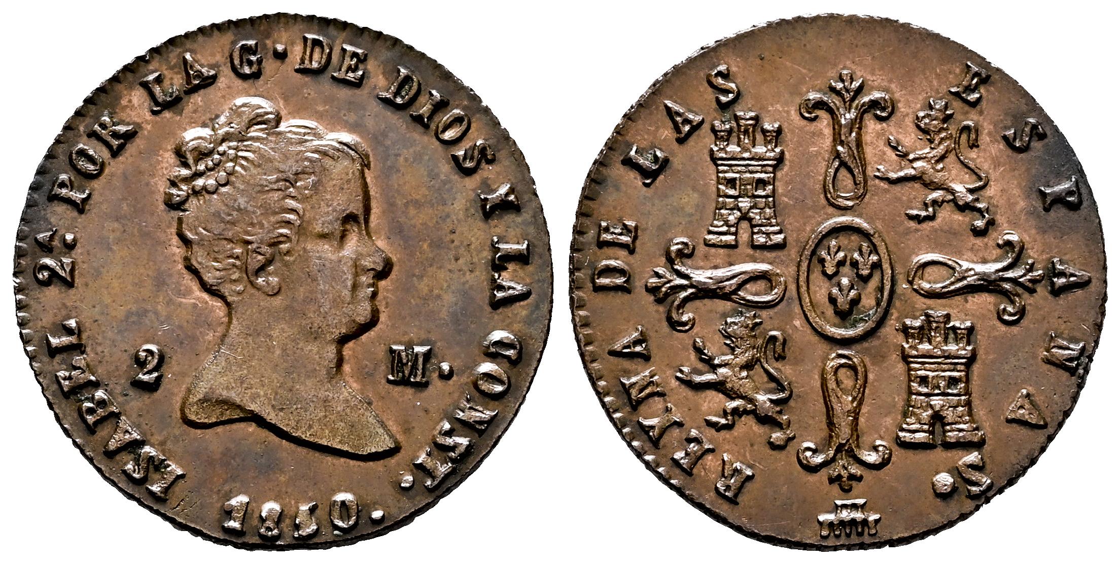 Isabel II (1833-1868). 2 maravedís. 1850. Segovia. (Cal-63). Ae. 2,25 g. Bonito ejemplar. Ex Áureo&Calicó 393 (07/07/2022), lote 892; Ex Áureo 154, Colección O'Donnell (19/11/2003), lote 26. EBC/EBC+. Est...90,00.