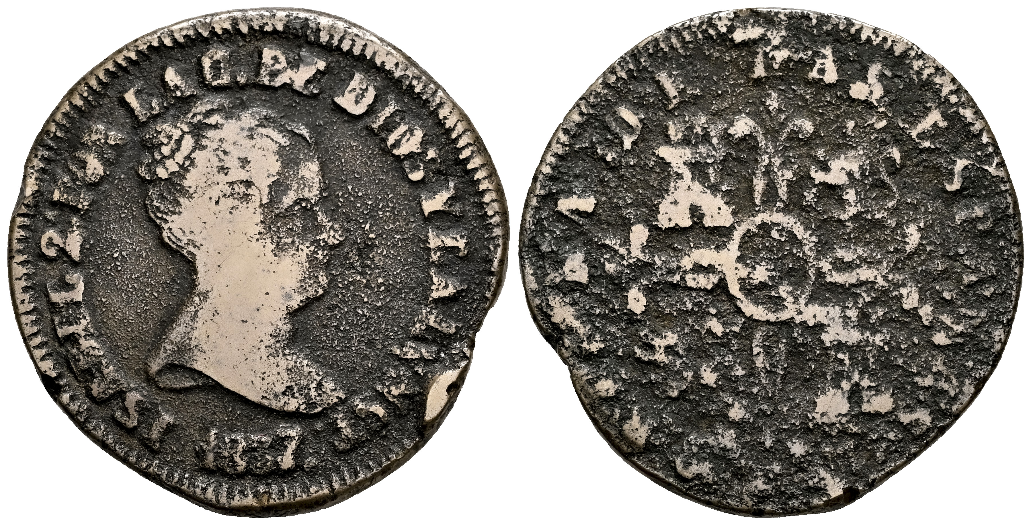 Isabel II (1833-1868). 8 maravedís. 1837. Pamplona. (Cal-119). Ae. 12,41 g. Fundida. BC+/BC. Est...45,00.