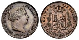 Isabel II (1833-1868). 5 céntimos de real. 1854. Segovia. (Cal-159). Ae. 1,97 g. Restos de brillo original, más acentuado en el reverso. Muy rara. SC-. Est...500,00.