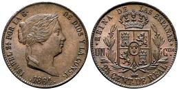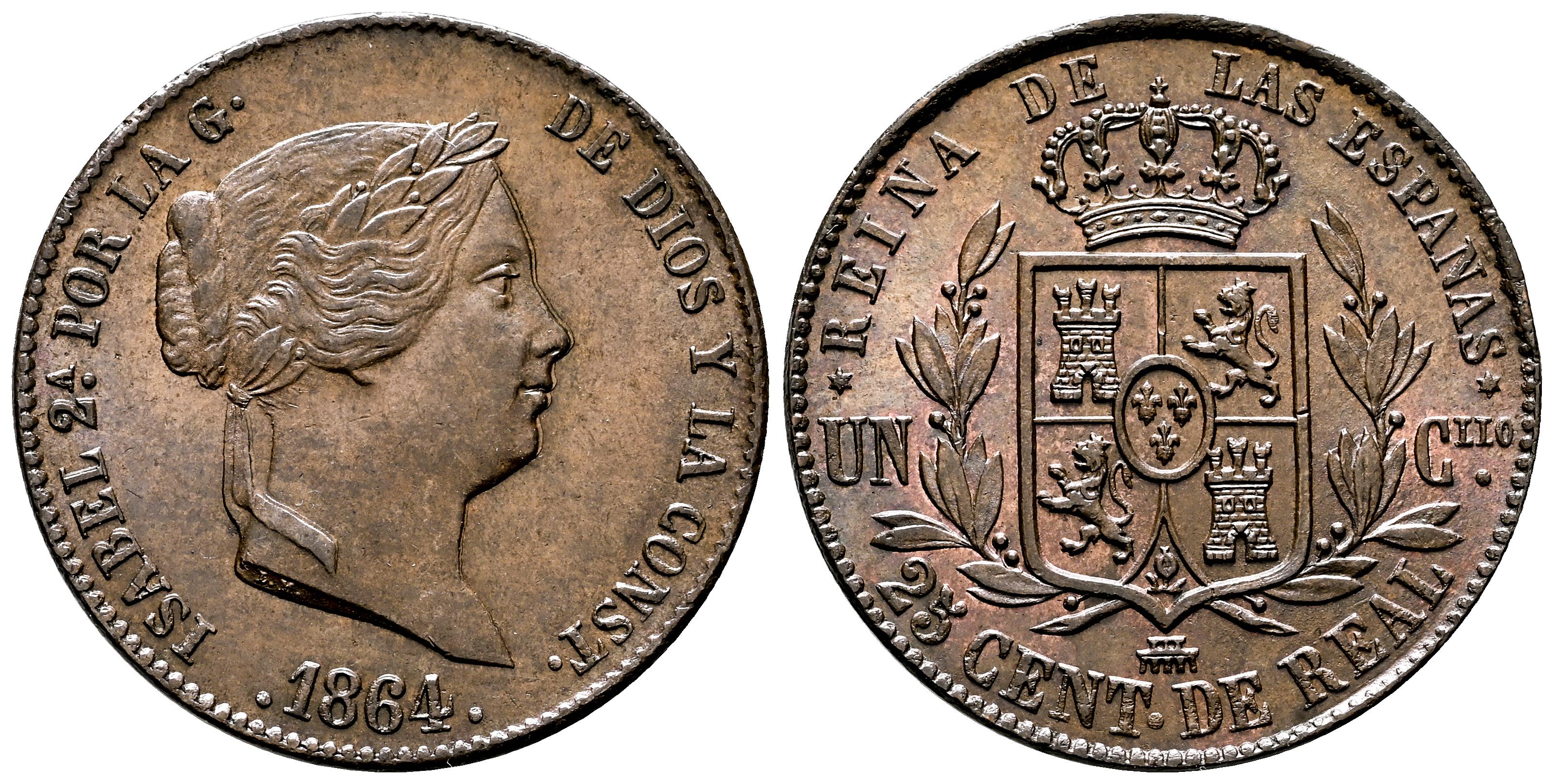 Isabel II (1833-1868). 25 céntimos de real. 1864. Segovia. (Cal-197). Ae. 10,23 g. Bonito color. Escasa así. EBC+/SC-. Est...150,00.