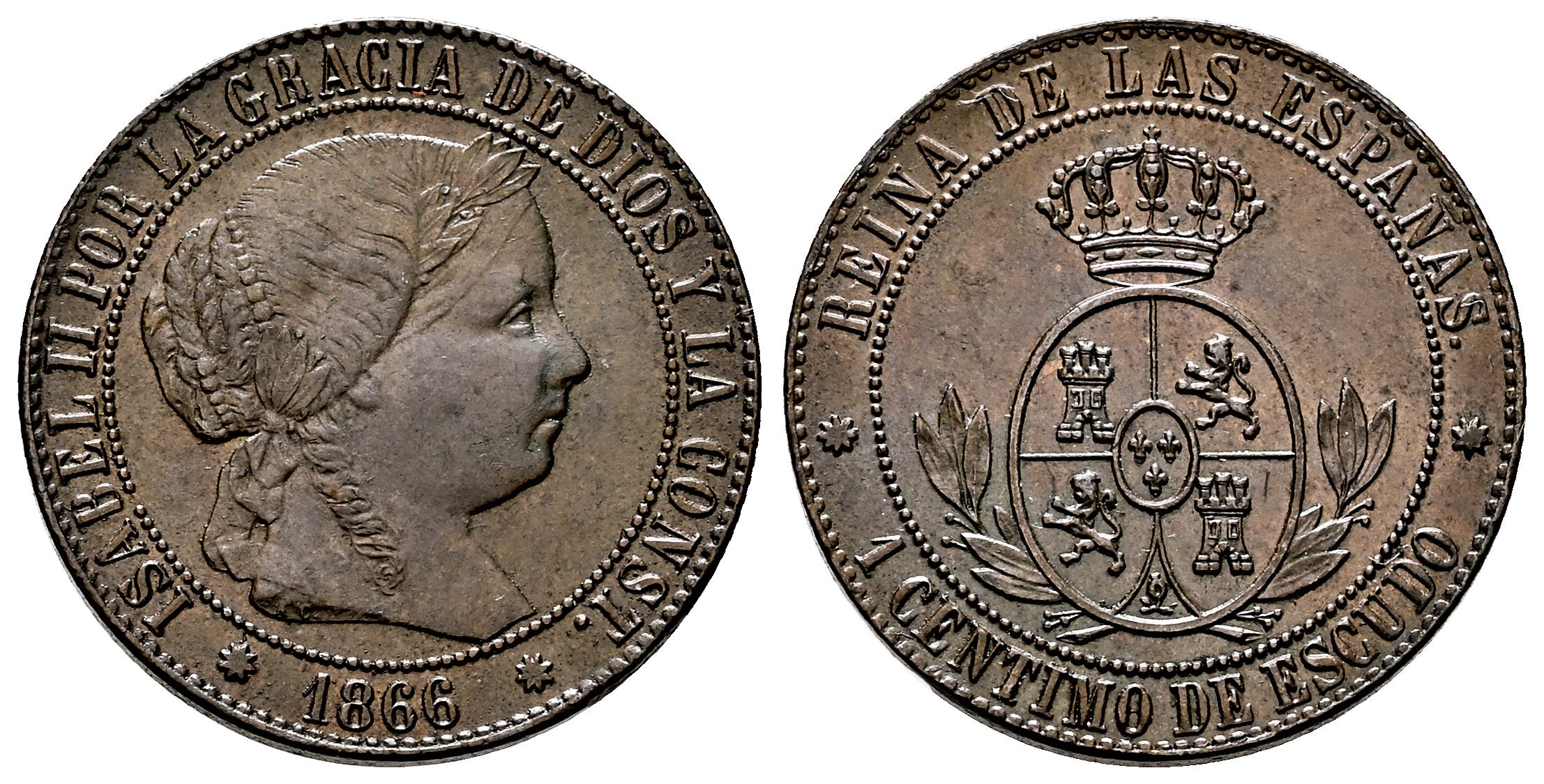 Isabel II (1833-1868). 1 céntimo de escudo. 1866. Barcelona. (Cal-213). Ae. 2,48 g. Sin OM. Ex Tauler&Fau (17/10/2022), lote 2977. MBC+/EBC-. Est...35,00.