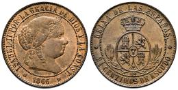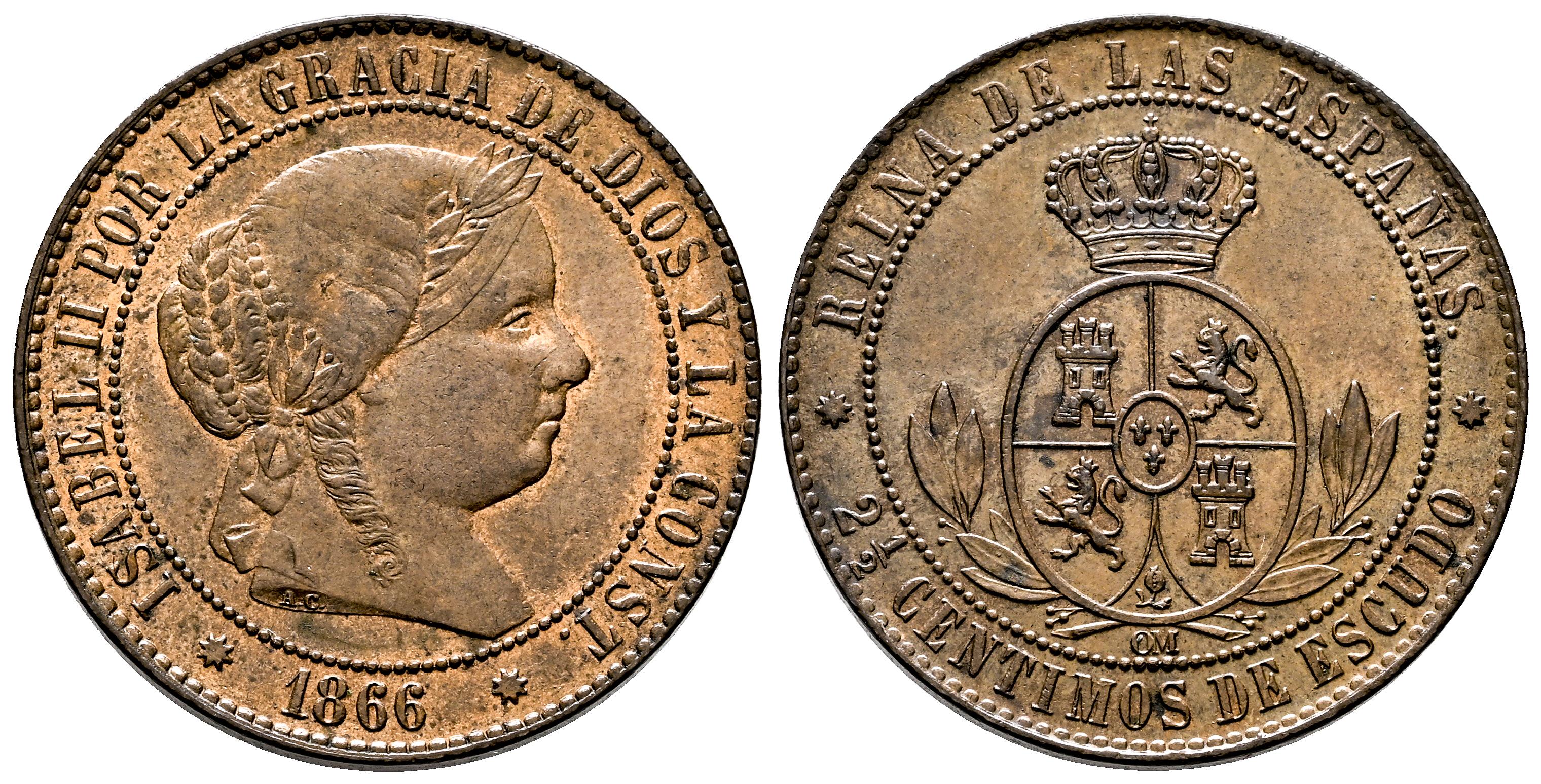 Isabel II (1833-1868). 2 1/2 céntimos de escudo. 1866. Barcelona. OM. (Cal-231). Ae. 6,20 g. Restos de brillo original. EBC. Est...60,00.
