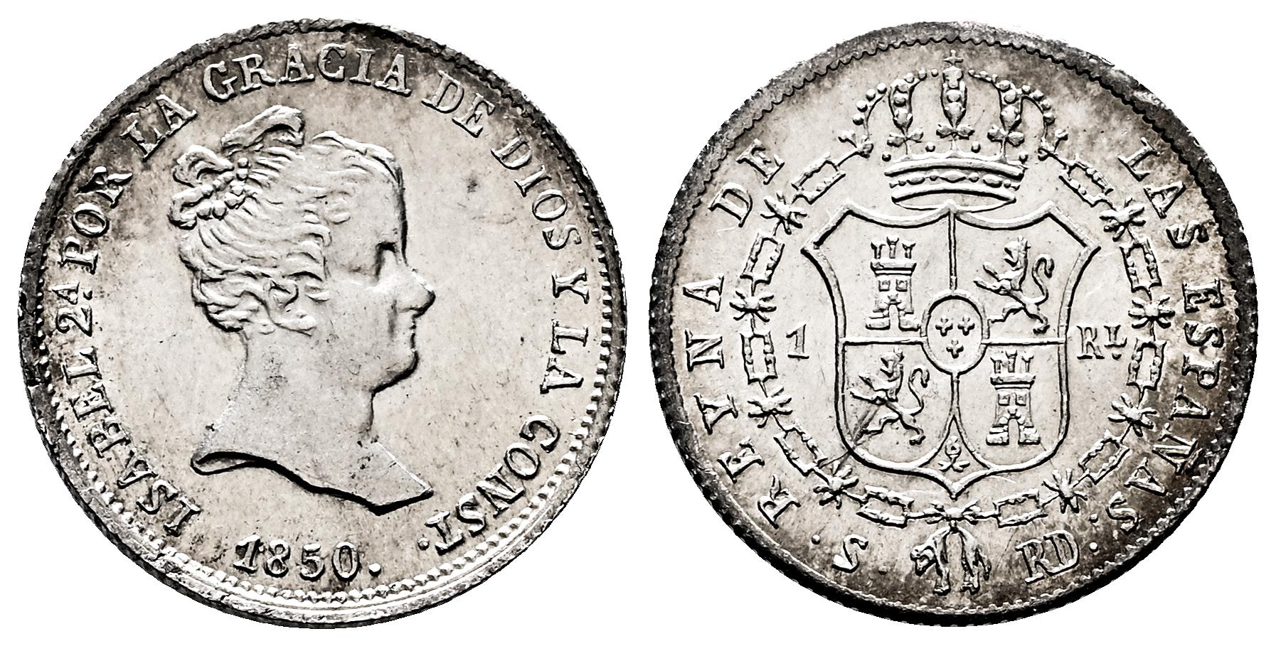 Isabel II (1833-1868). 1 real. 1850. Sevilla. RD. (Cal-318). Ag. 1,26 g. Magnífico ejemplar. Pleno brillo original. Rara así. SC. Est...200,00.