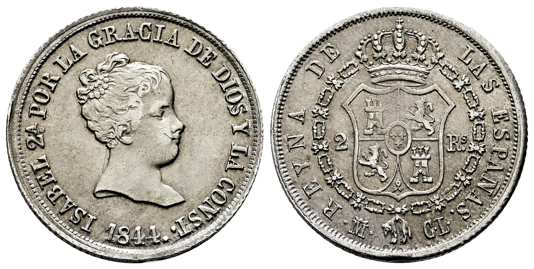 Isabel II (1833-1868). 2 reales. 1844. Madrid. CL. (Cal-362). Ag. 2,93 g. Golpecitos en canto. BC+/MBC-. Est...35,00.