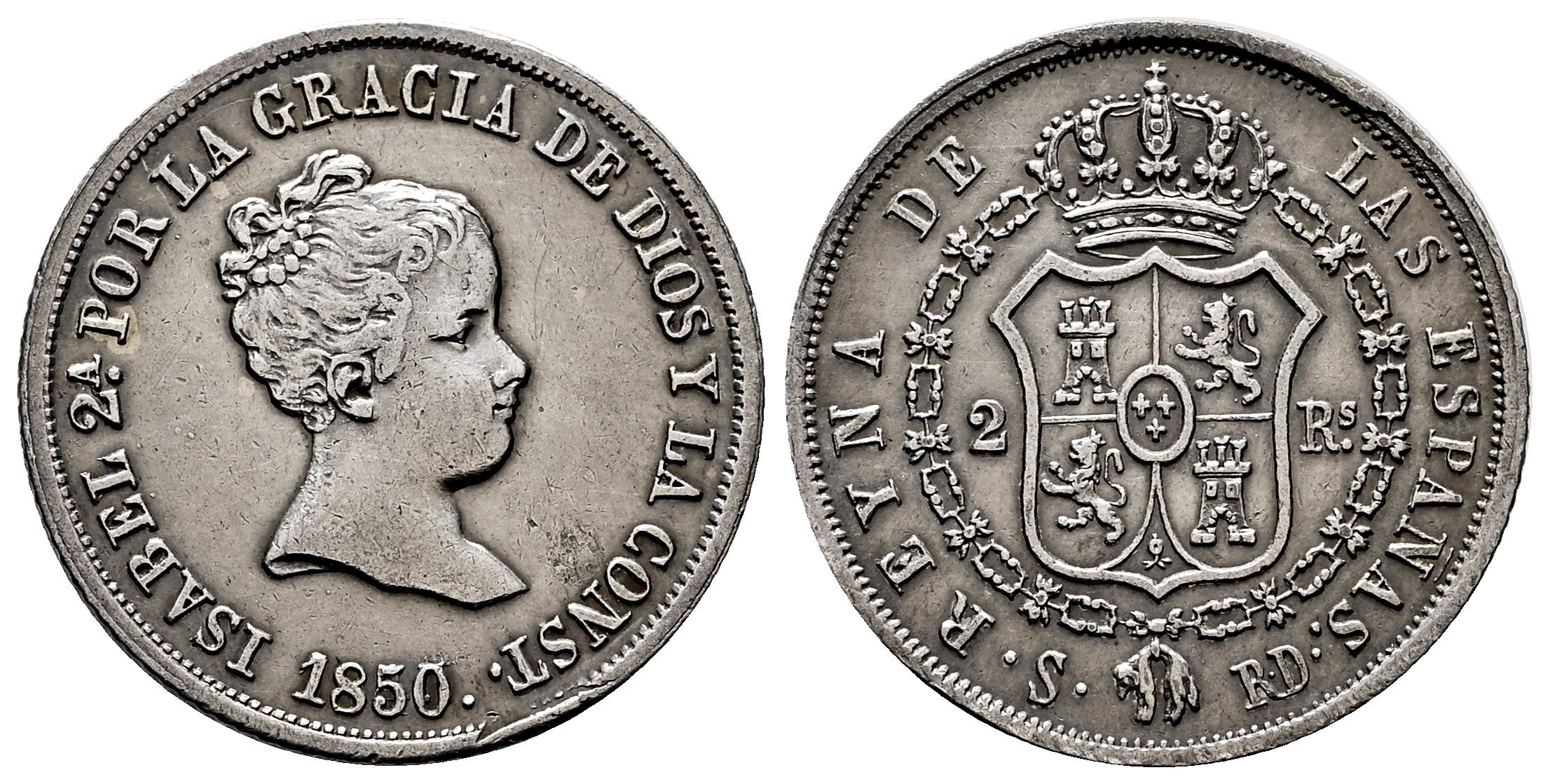 Isabel II (1833-1868). 2 reales. 1850/45. Sevilla. RD. (Cal-385). Ag. 2,53 g. Sobrefecha. Ligeramente limpiada. Escasa. MBC+/EBC-. Est...100,00.
