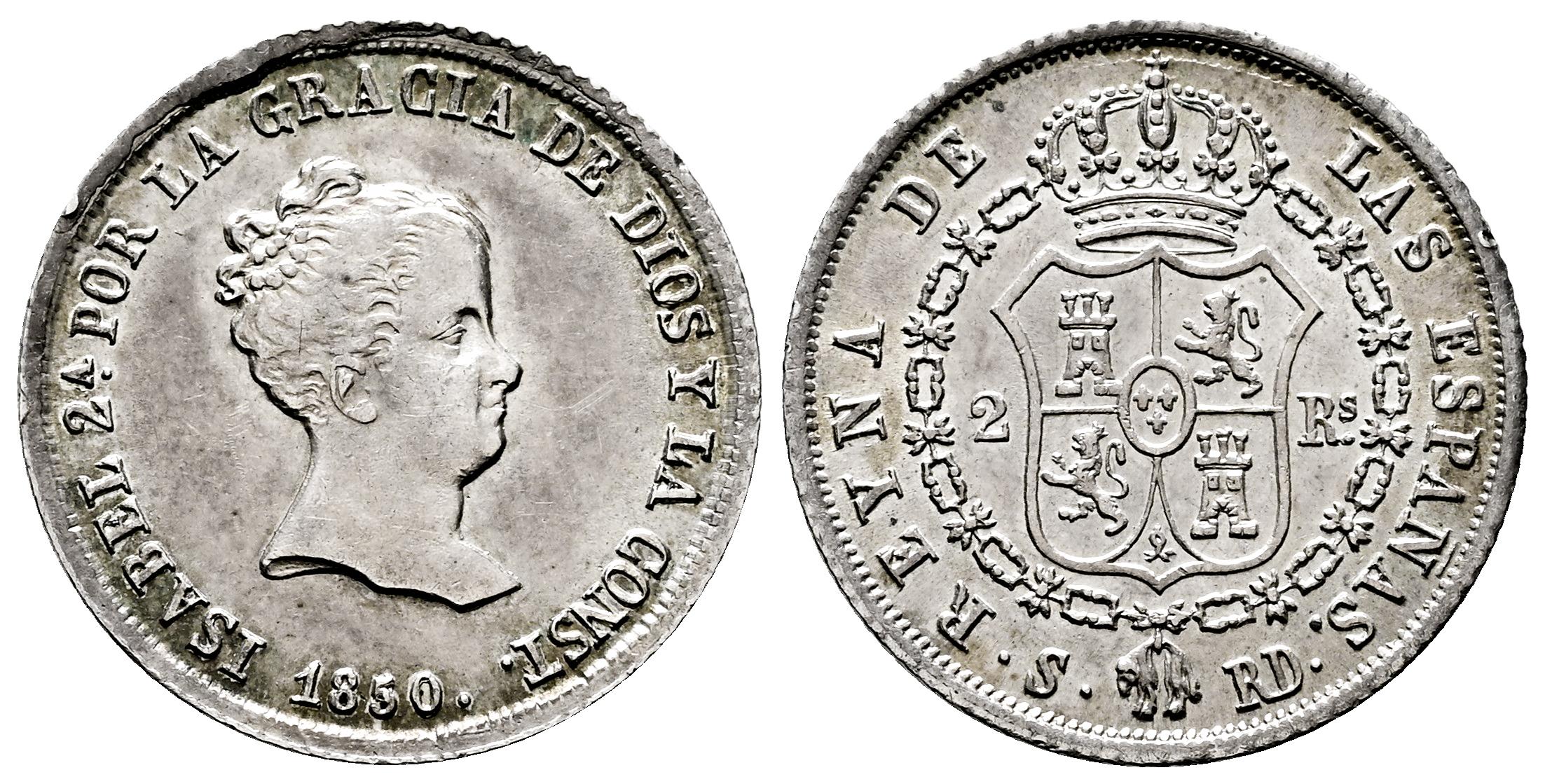 Isabel II (1833-1868). 2 reales. 1850. Sevilla. RD. (Cal-387). Ag. 2,56 g. Sobrefecha. Ligero tono. MBC+/EBC-. Est...100,00.