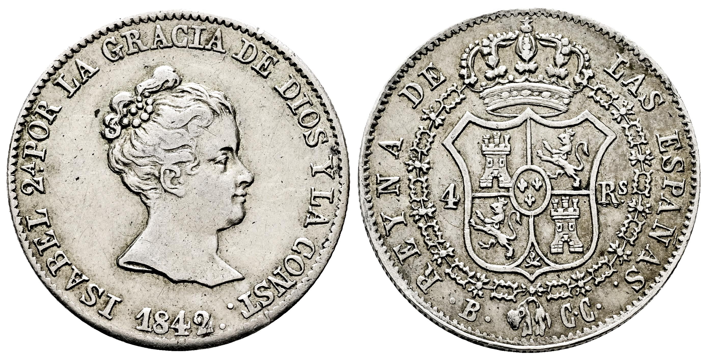 Isabel II (1833-1868). 4 reales. 1842. Barcelona. CC. (Cal-424). Ag. 5,79 g. Busto pequeño. Rayitas. Rara. MBC+. Est...100,00.