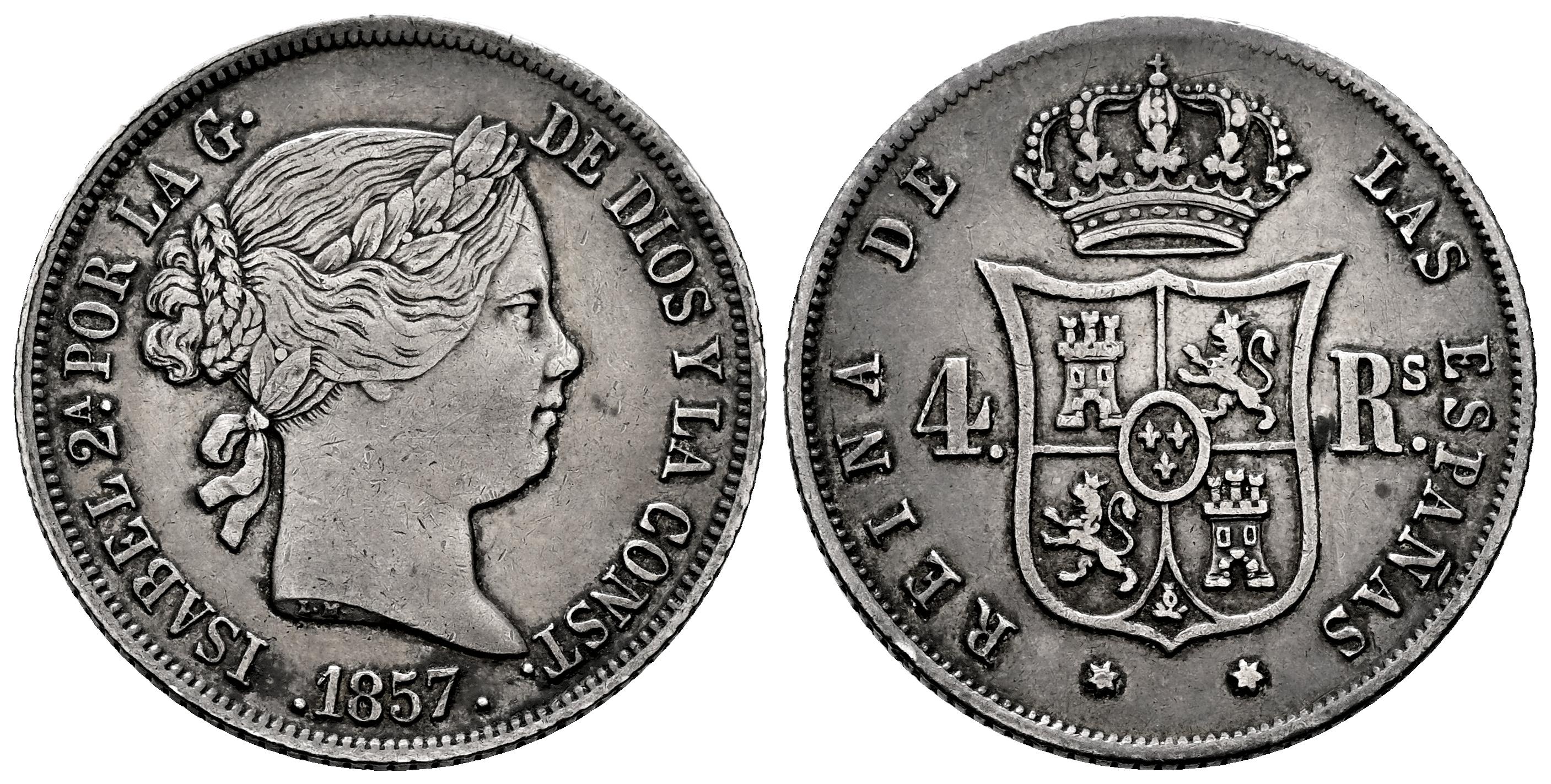 Isabel II (1833-1868). 4 reales. 1857. Madrid. (Cal-463). Ag. 5,14 g. Pátina. Ex Tauler&Fau (31/01/2023), lote 1011. MBC. Est...70,00.