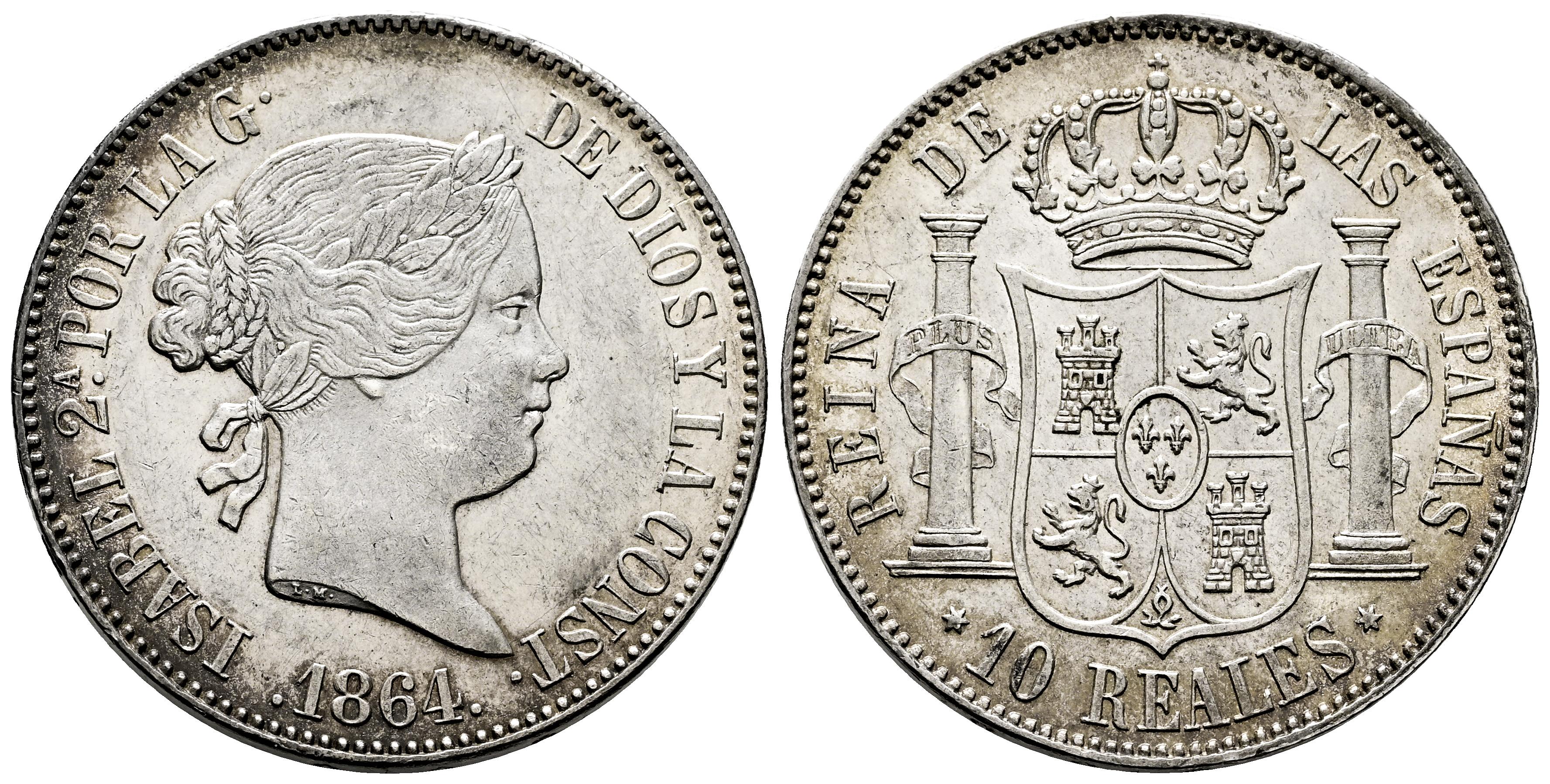 Isabel II (1833-1868). 10 reales. 1864. Madrid. (Cal-541). Ae. 12,90 g. Restos de brillo original. Ligero tono. Escasa. EBC. Est...150,00.