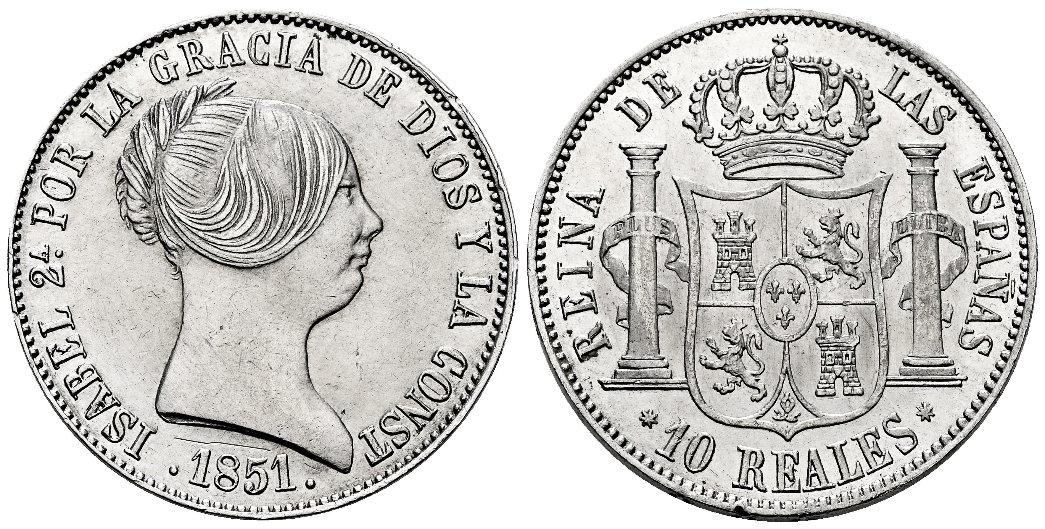 Isabel II (1833-1868). 10 reales. 1851. Sevilla. (Cal-546). Ae. 13,03 g. Restos de brillo original. Suave limpieza y leves golpecitos en el canto. Raya bajo el busto. Rara. EBC-/EBC. Est...500,00.