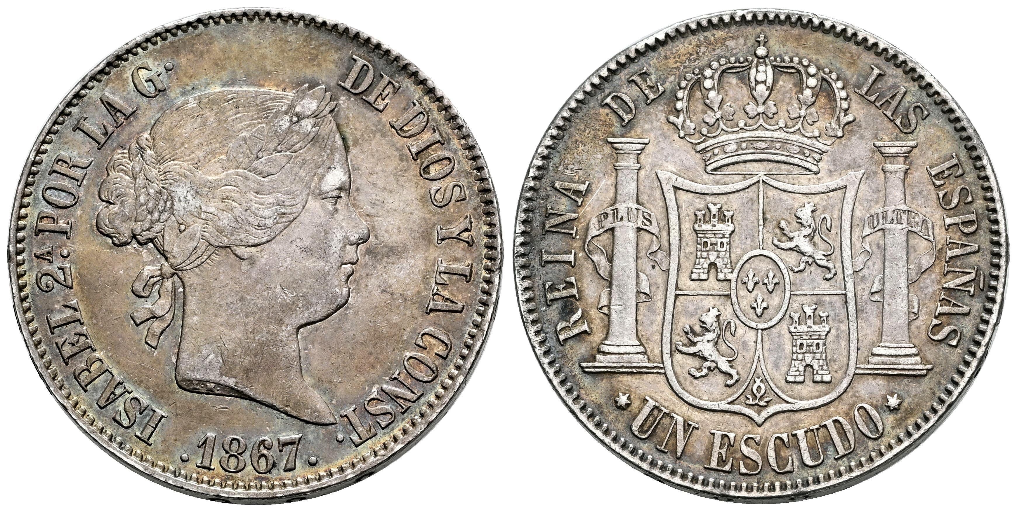 Isabel II (1833-1868). 1 escudo. 1867. Madrid. (Cal-565). Ag. 12,70 g. Golpe en el canto. Ligero tono iridiscente. MBC+. Est...150,00.