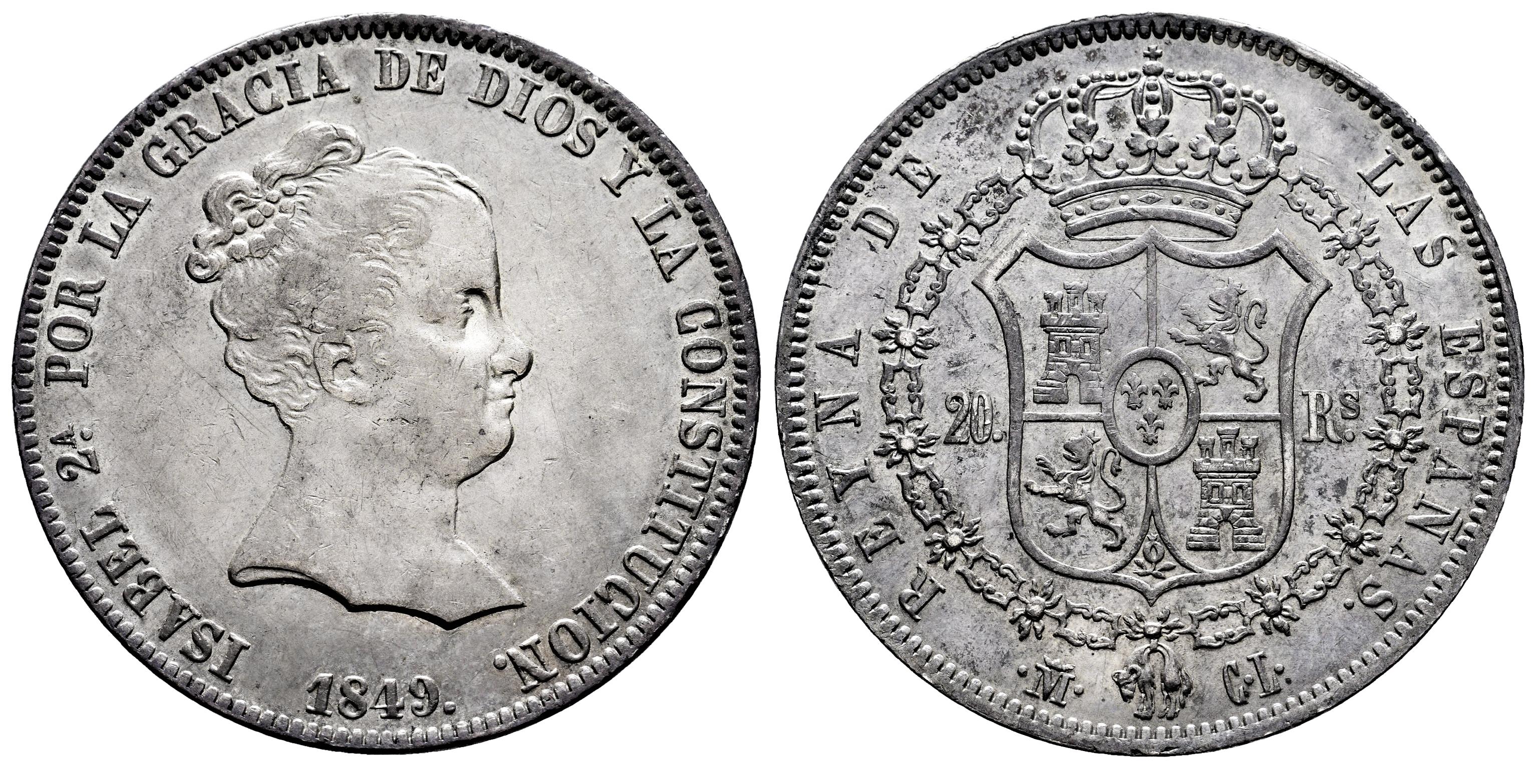 Isabel II (1833-1868). 20 reales. 1849. Madrid. CL. (Cal-588). Ag. 25,99 g. Suave tono e ínfimas rayitas. EBC-. Est...500,00.