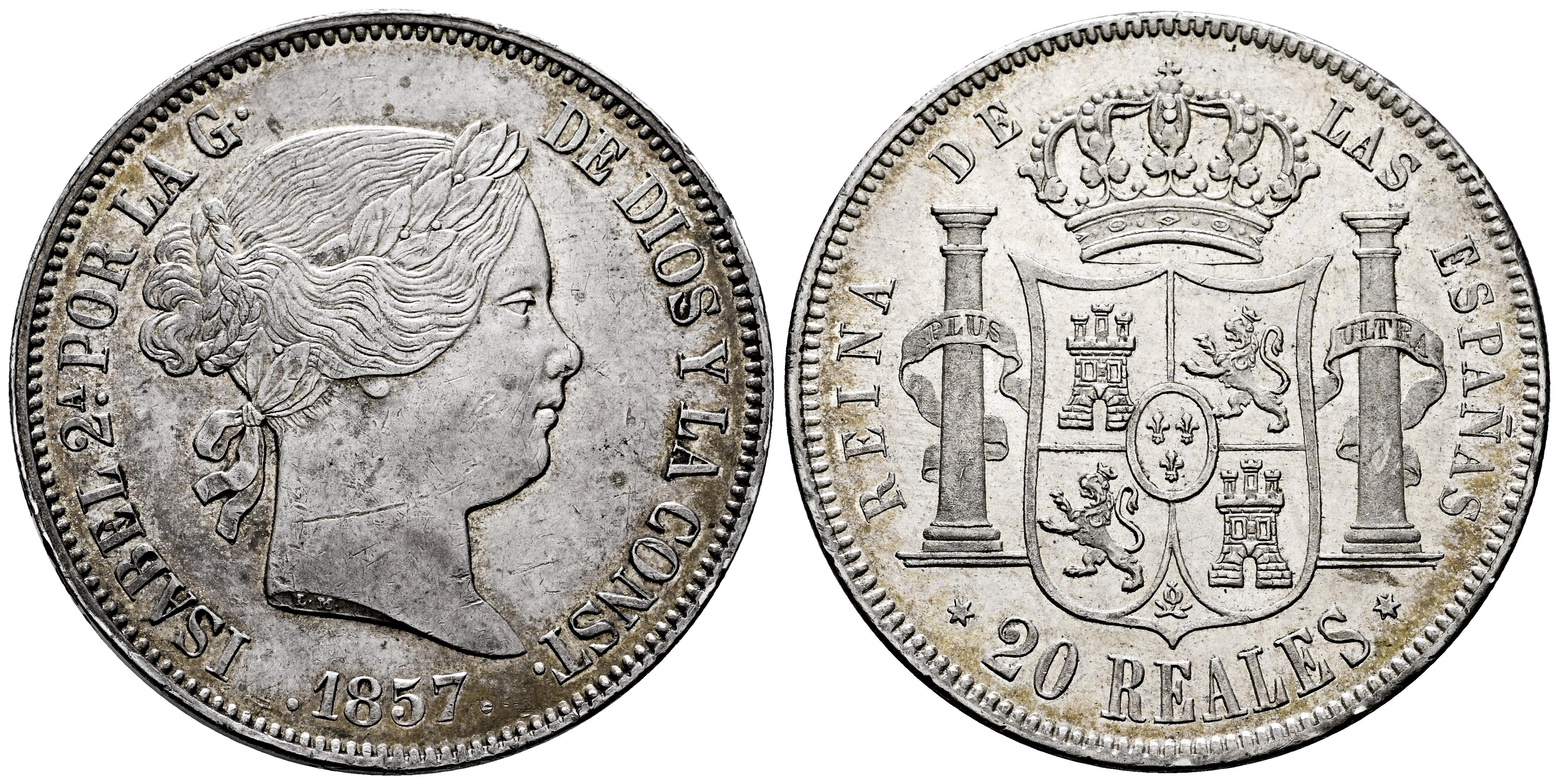 Isabel II (1833-1868). 20 reales. 1857. Madrid. (Cal-614). Ag. 25,88 g. Suave pátina con ligero tono. Rayas en anverso. Restos de brillo original en reverso. Escasa así. EBC/EBC+. Est...300,00.