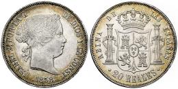 Isabel II (1833-1868). 20 reales. 1858. Madrid. (Cal-615). Ag. 26,18 g. Ligero tono iridiscente en las periferias. Restos de brillo original. EBC-/EBC. Est...300,00.
