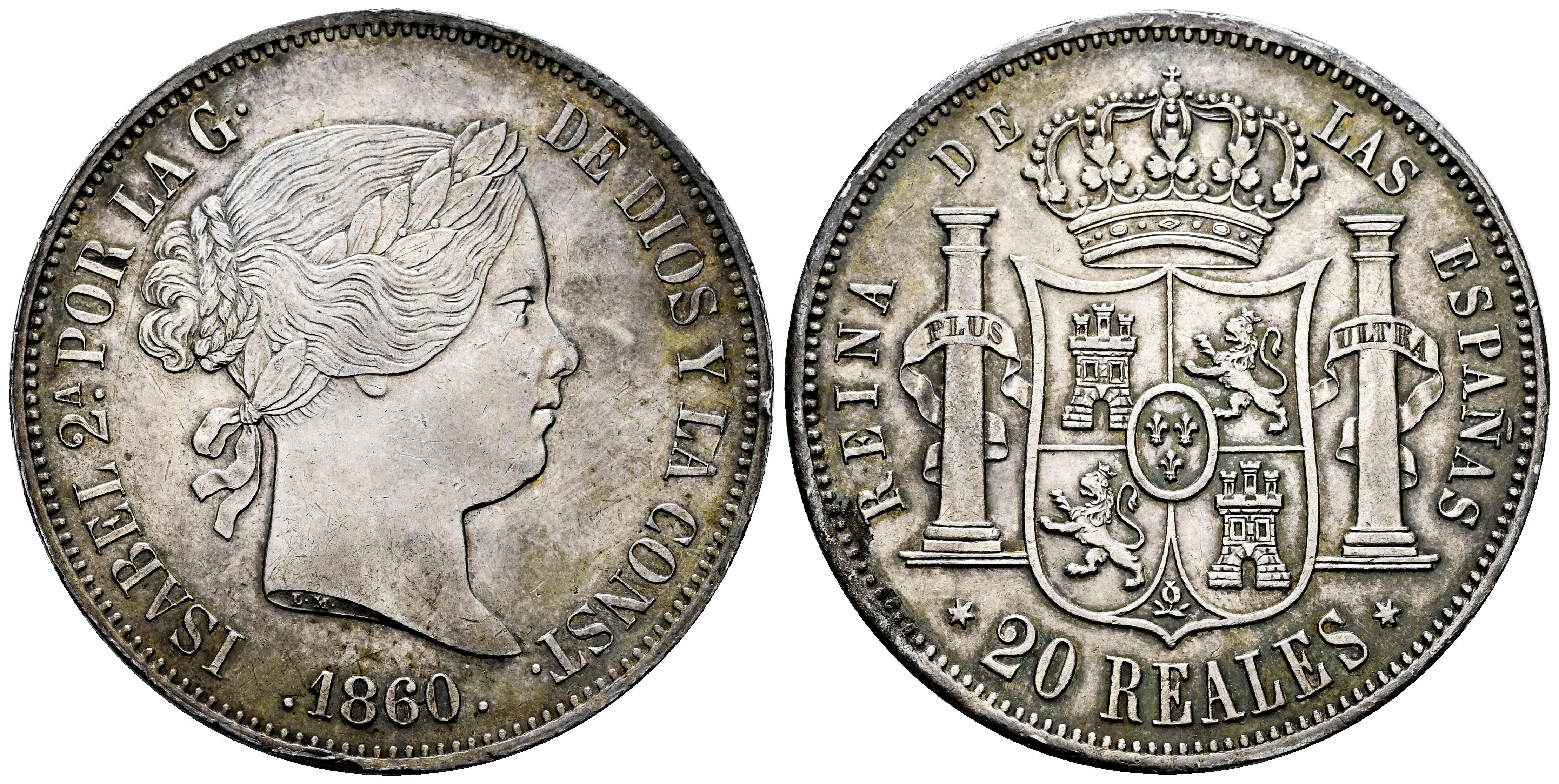 Isabel II (1833-1868). 20 reales. 1860. Madrid. (Cal-617). Ag. 25,95 g. Suave pátina de monetario. Leves marquitas y golpecito en el canto. EBC. Est...300,00.