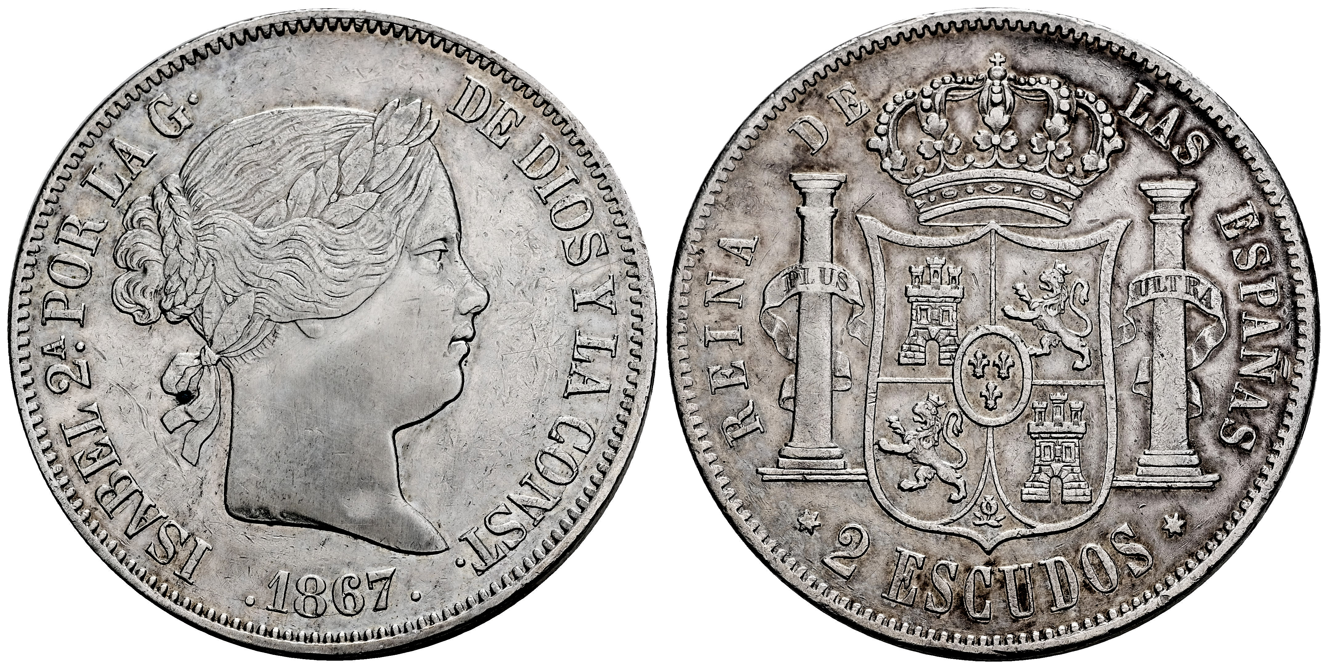 Isabel II (1833-1868). 2 escudos. 1867. Madrid. (Cal-647). Ag. 26,12 g. Rayitas. MBC+. Est...120,00.