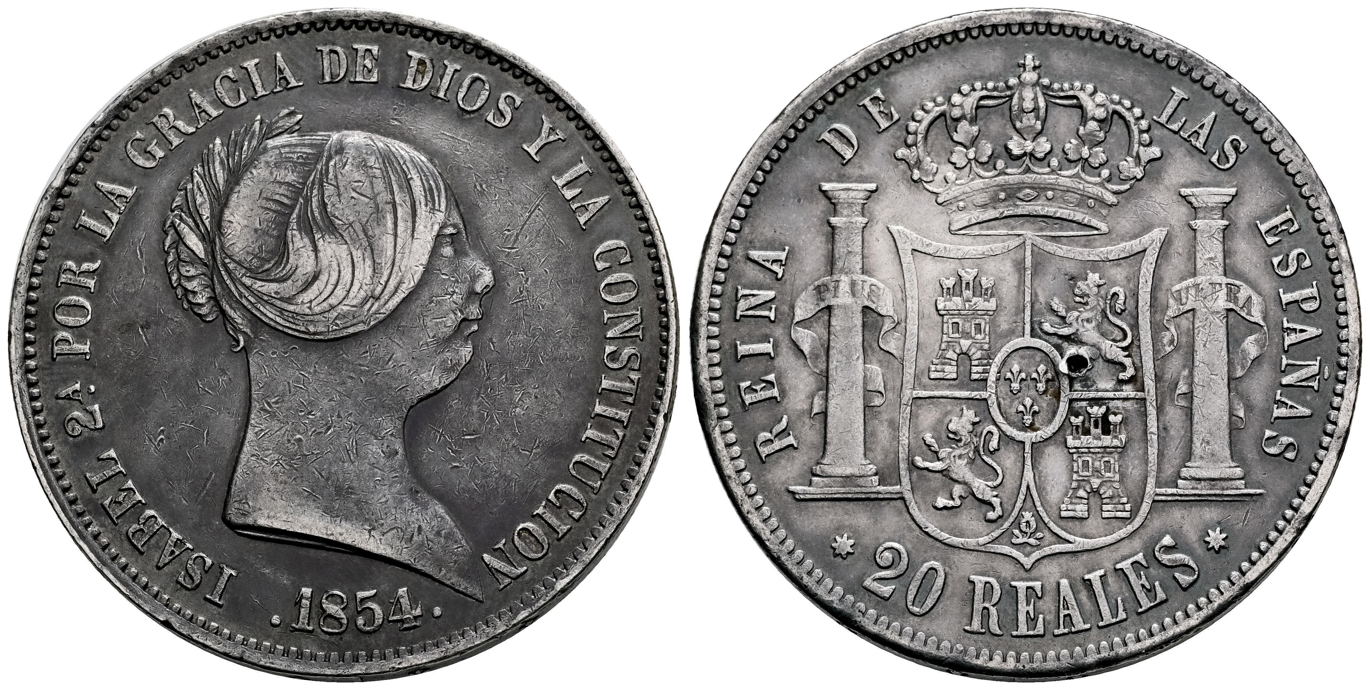 Isabel II (1833-1868). 20 reales. 1854. Sevilla. (Cal-629). Ag. 26,67 g. Golpe en el reverso. MBC+. Est...150,00.