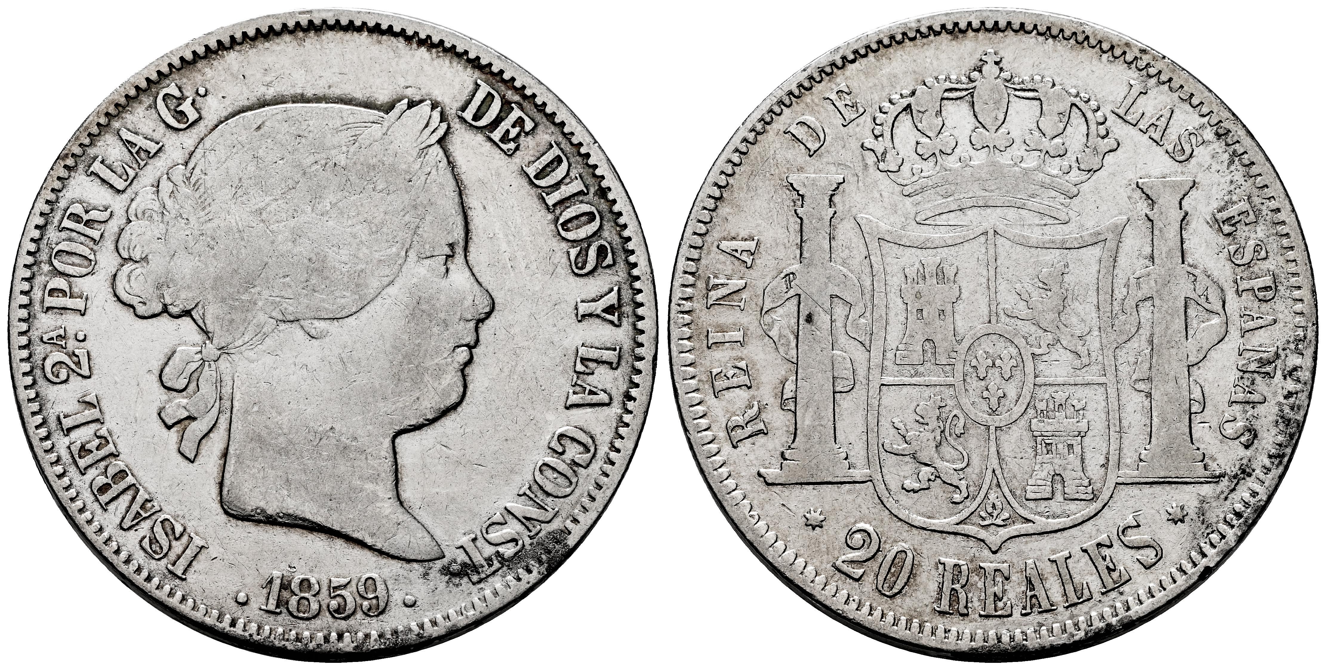 Isabel II (1833-1868). 20 reales. 1859. Sevilla. (Cal-636). Ag. 25,54 g. Limpiada. Ex Jesús Vico, diciembre 2010, lote 732. Ex Colección José Octavio Busto. Conserva etiqueta del coleccionista. BC. Est...80,00.