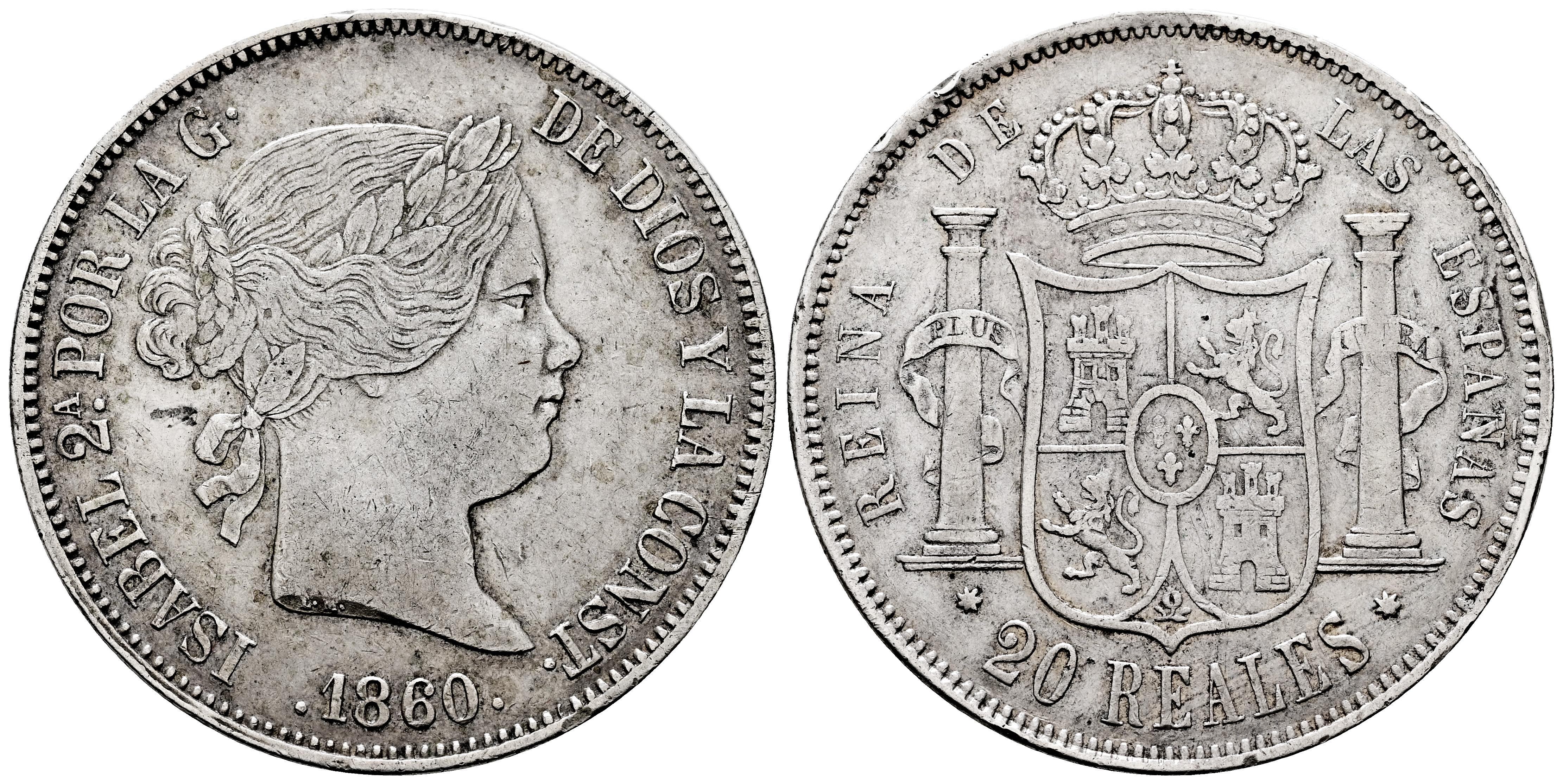 Isabel II (1833-1868). 20 reales. 1860. Sevilla. (Cal-639). Ag. 25,73 g. Golpes en el canto . MBC. Est...120,00.