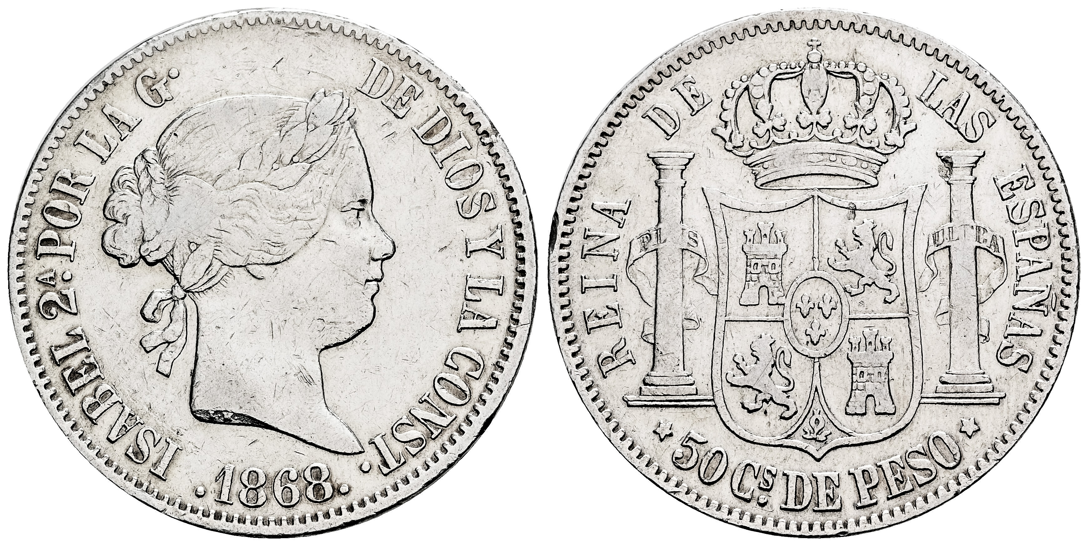 Isabel II (1833-1868). 50 centavos. 1868. Manila. (Cal-667). Ag. 12,82 g. Limpiada. BC+. Est...65,00.