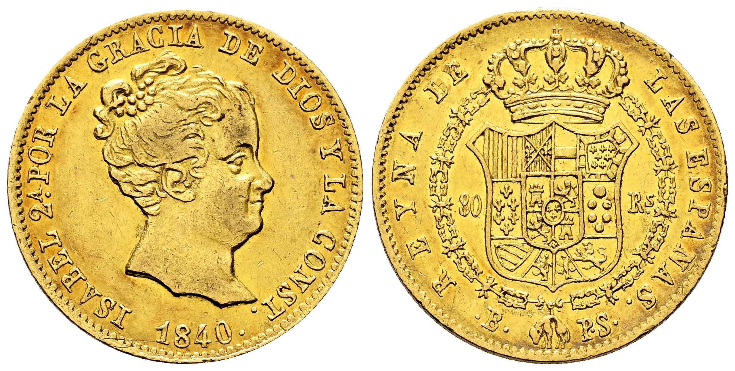 Isabel II (1833-1868). 80 reales. 1840. Barcelona. PS. (Cal-705). Au. 6,72 g. Restos de brillo original . MBC+/EBC-. Est...600,00.