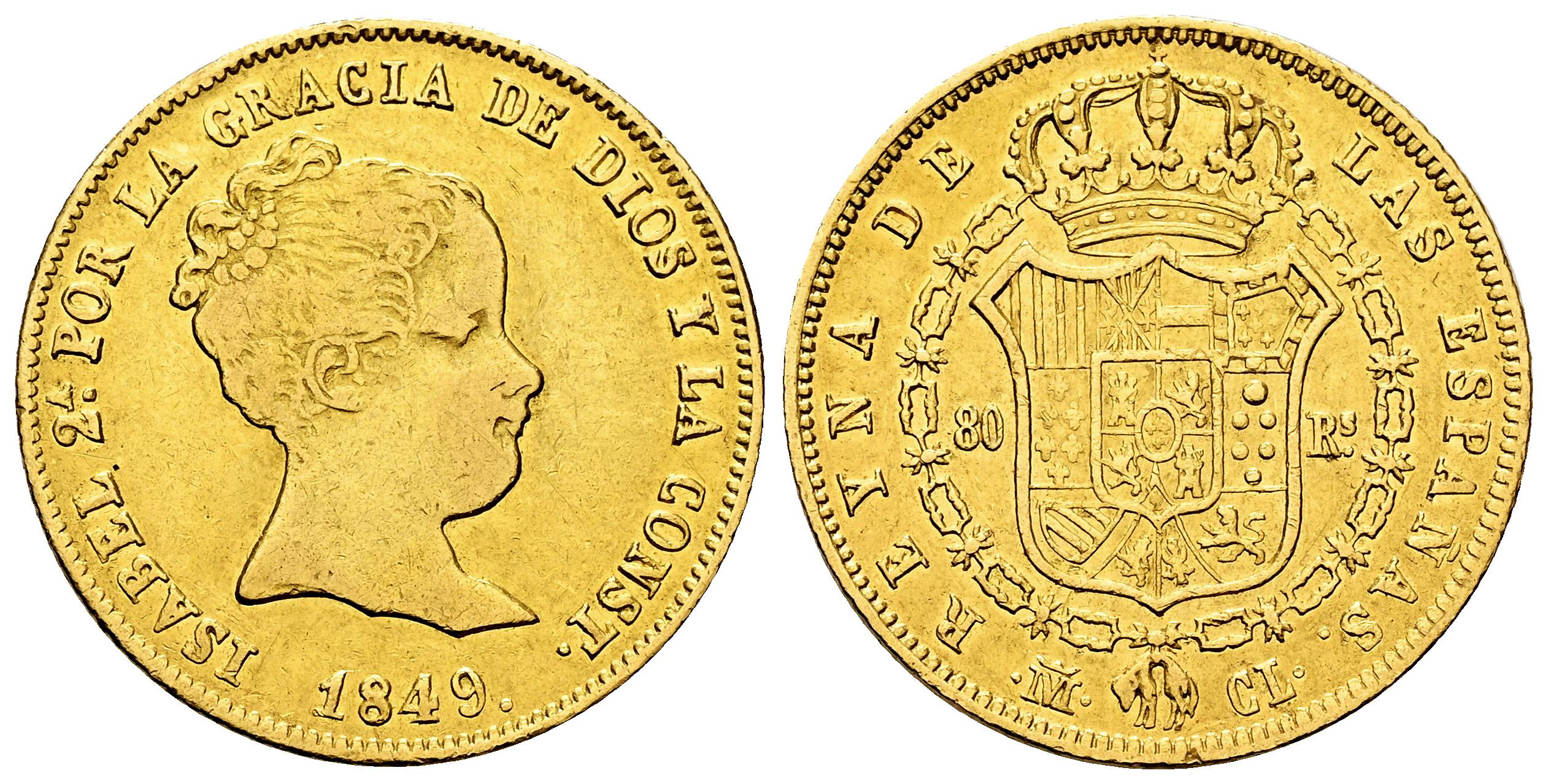 Isabel II (1833-1868). 80 reales. 1849. Madrid. CL. (Cal-736). Au. 6,71 g. Golpecito en el canto. Rara. MBC-/MBC. Est...500,00.