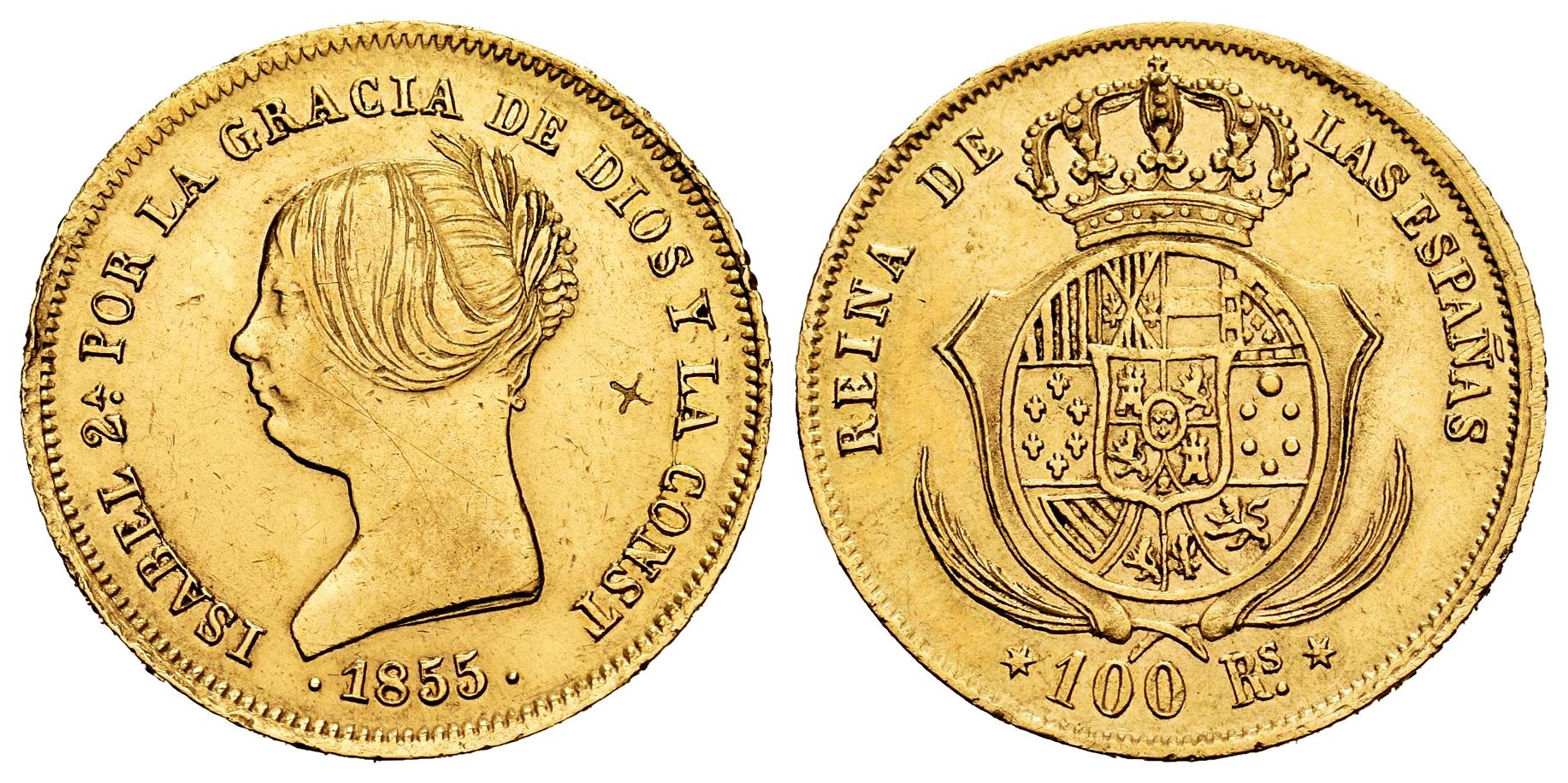 Isabel II (1833-1868). 100 reales. 1855. Madrid. (Cal-781). Au. 8,44 g. Golpes en el canto. Contramarca en el anverso. Limpiada. MBC+/EBC-. Est...750,00.