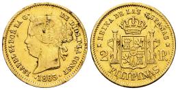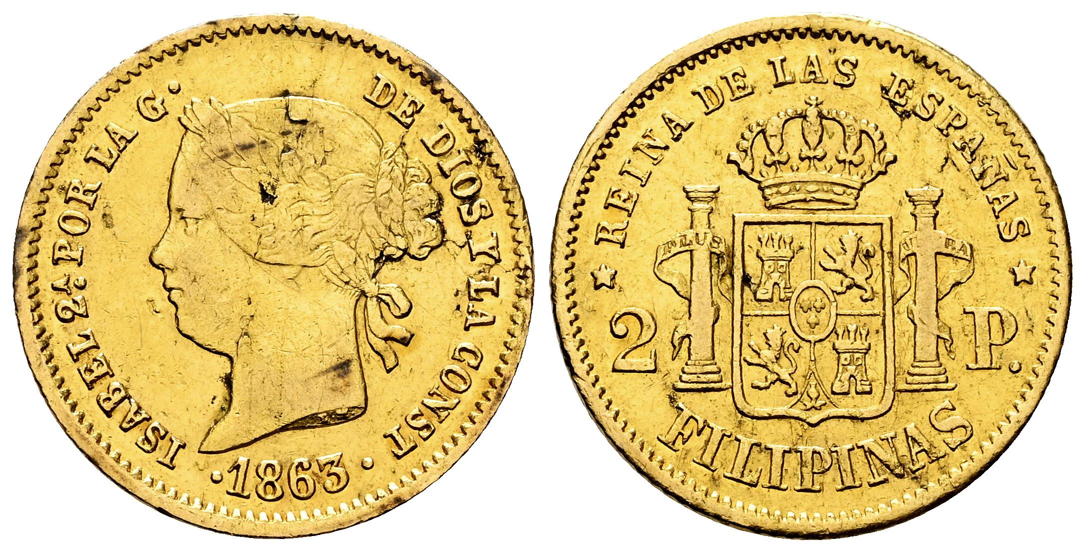 Isabel II (1833-1868). 2 pesos. 1863/2. Manila. (Cal-840). Au. 3,34 g. Sobrefecha. Hojitas y golpecitos. Restos de brillo original. MBC-/MBC. Est...400,00.