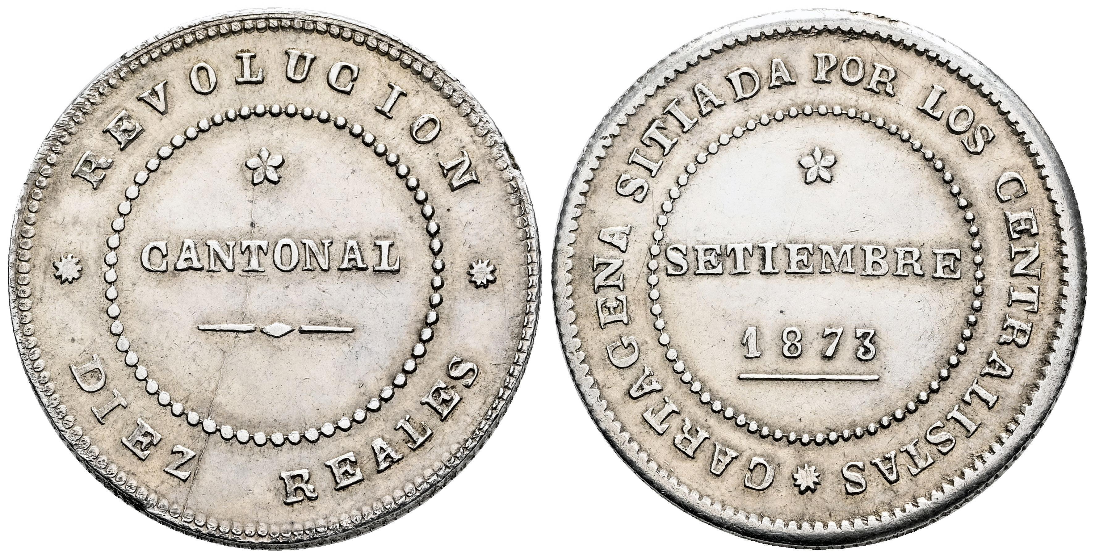 Centenario de la Peseta (1868-1931). Revolución Cantonal. 10 reales. 1873. Cartagena (Murcia). (Cal-4). Ag. 13,59 g. Leve defecto en el canto. Limpiada. Rara. EBC-. Est...700,00.