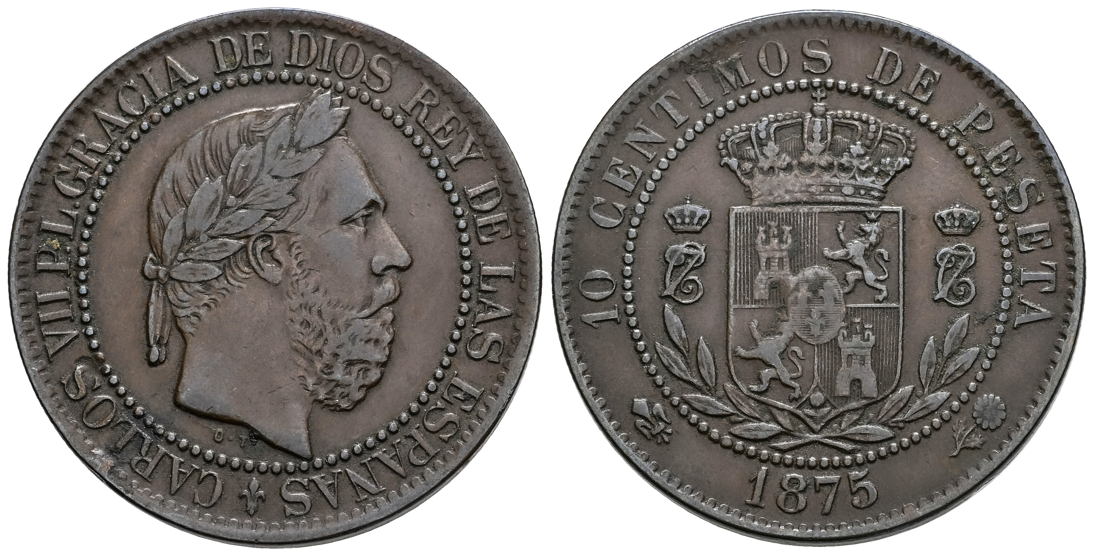Centenario de la Peseta (1868-1931). Carlos VII (1872-1876). 10 céntimos. 1875. Oñate. (Cal-4). Ae. 10,23 g. MBC-. Est...50,00.