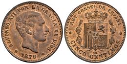 Centenario de la Peseta (1868-1931). Alfonso XII (1874-1885). 5 céntimos. 1879. Barcelona. OM. (Cal-6). Ae. 5,03 g. Brillo original. Ex Tauler&Fau (17/05/2017) lote 782. EBC+. Est...200,00.