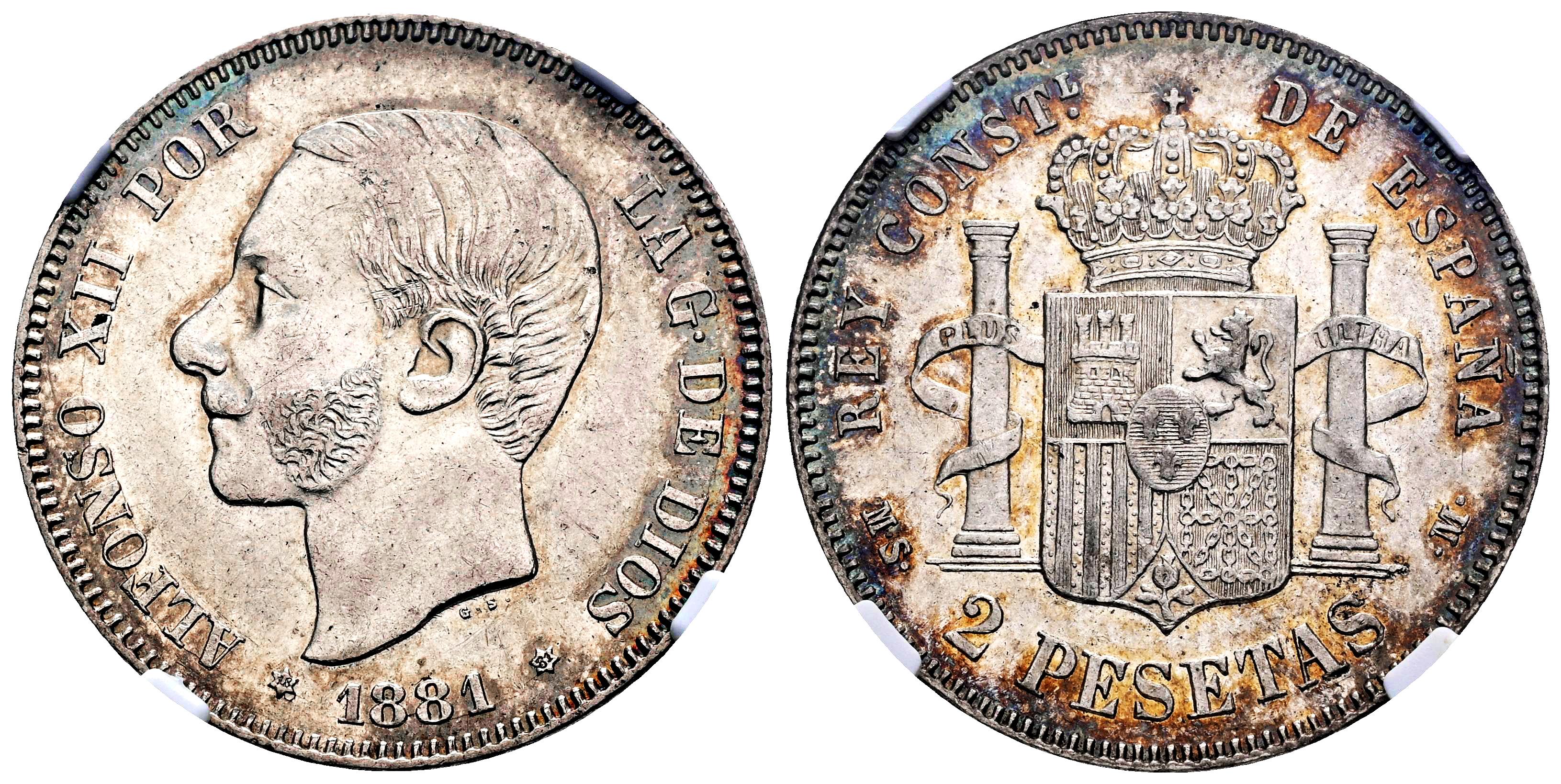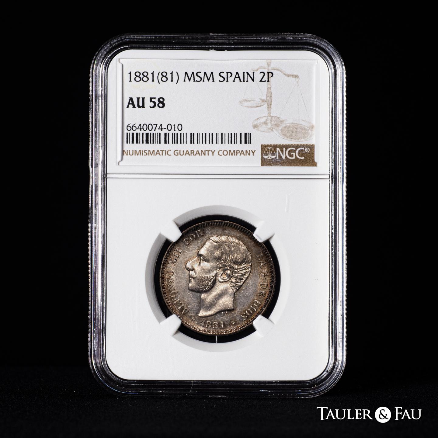 Centenario de la Peseta (1868-1931). Alfonso XII (1874-1885). 2 pesetas. 1881*18-81. Madrid. MSM. (Cal-28). Ag. 10,00 g. Restos de brillo original. Ligera pátina iridiscente. Encapsulada por NGC como AU 58. Ex Tauler&Fau 136 (29/11/2023), lote 304. Est...400,00.