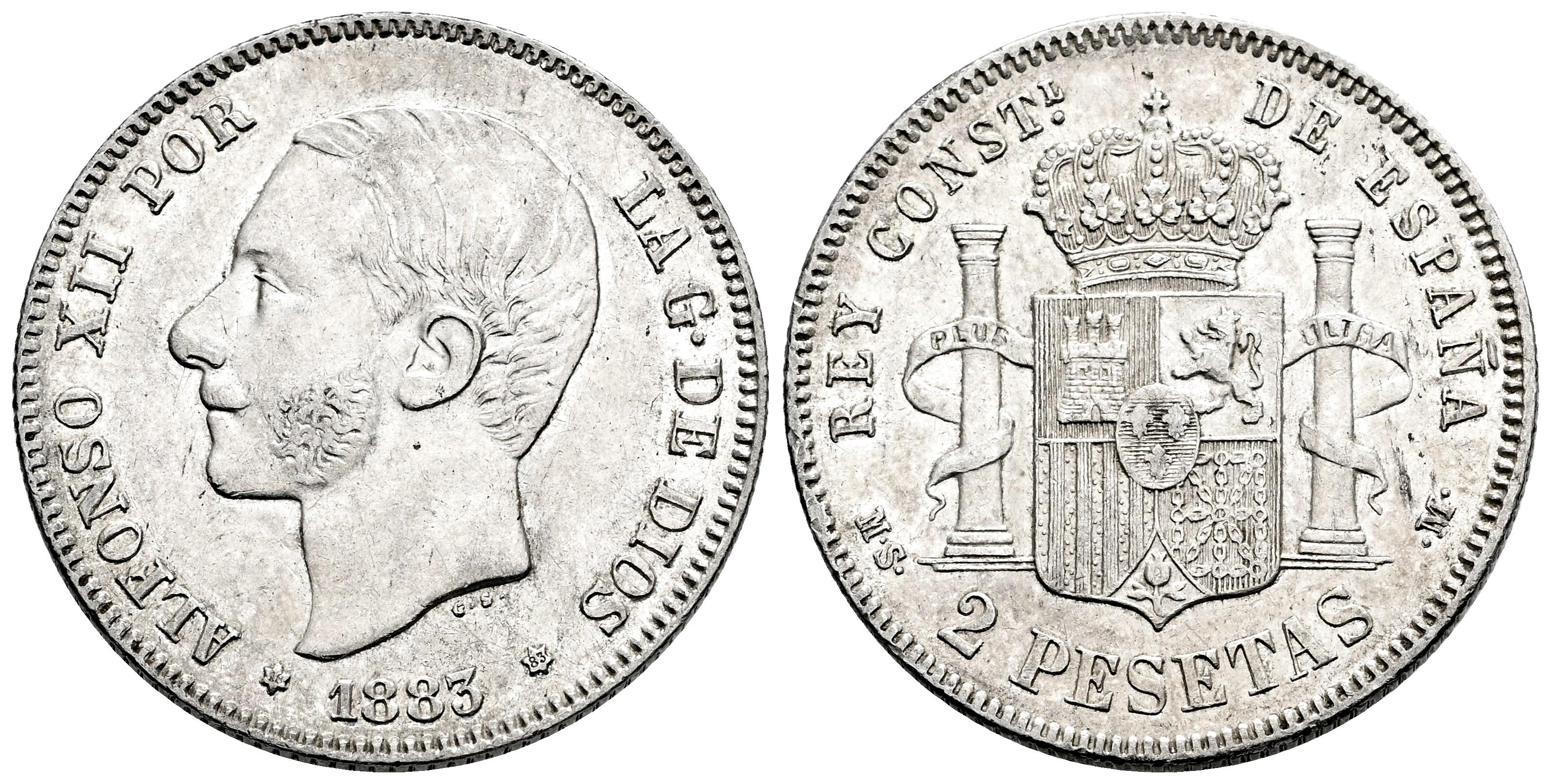 Centenario de la Peseta (1868-1931). Alfonso XII (1874-1885). 2 pesetas. 1883*18-83. Madrid. MSM. (Cal-33). Ag. 10,02 g. Restos de brillo original. EBC. Est...200,00.