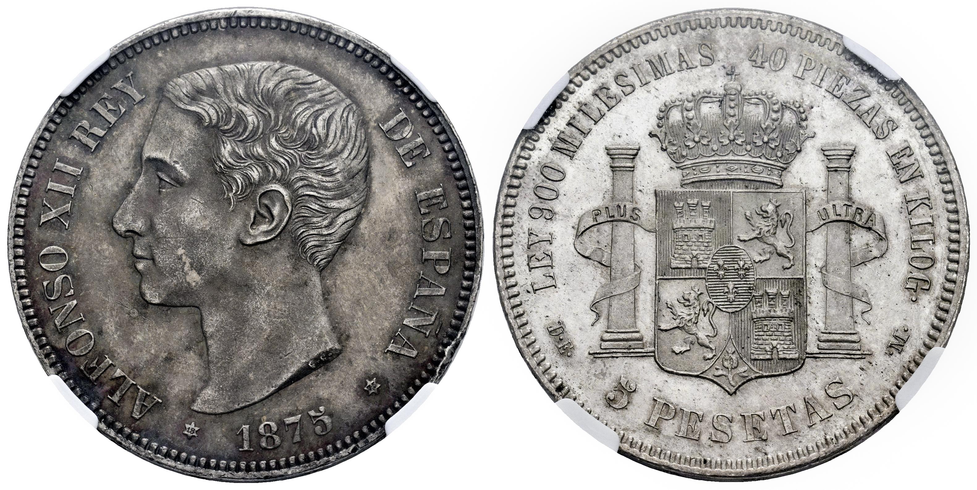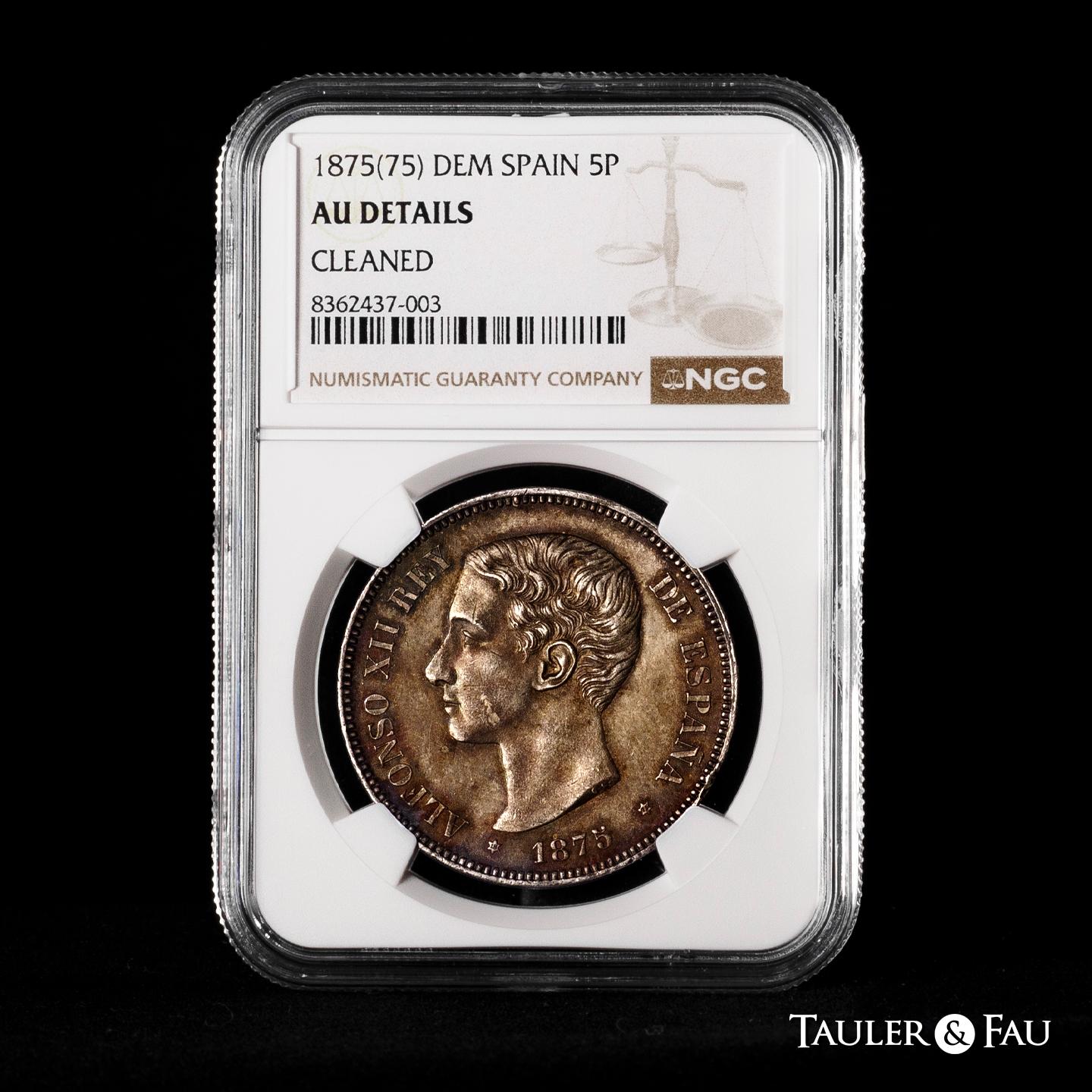 Centenario de la Peseta (1868-1931). Alfonso XII (1874-1885). 5 pesetas. 1875*18-75. Madrid. DEM. (Cal-35). Ag. Ligera pátina y suave limpieza. Golpecito en el canto. Encapsulada por NGC como AU Details, Cleaned. Est...100,00.