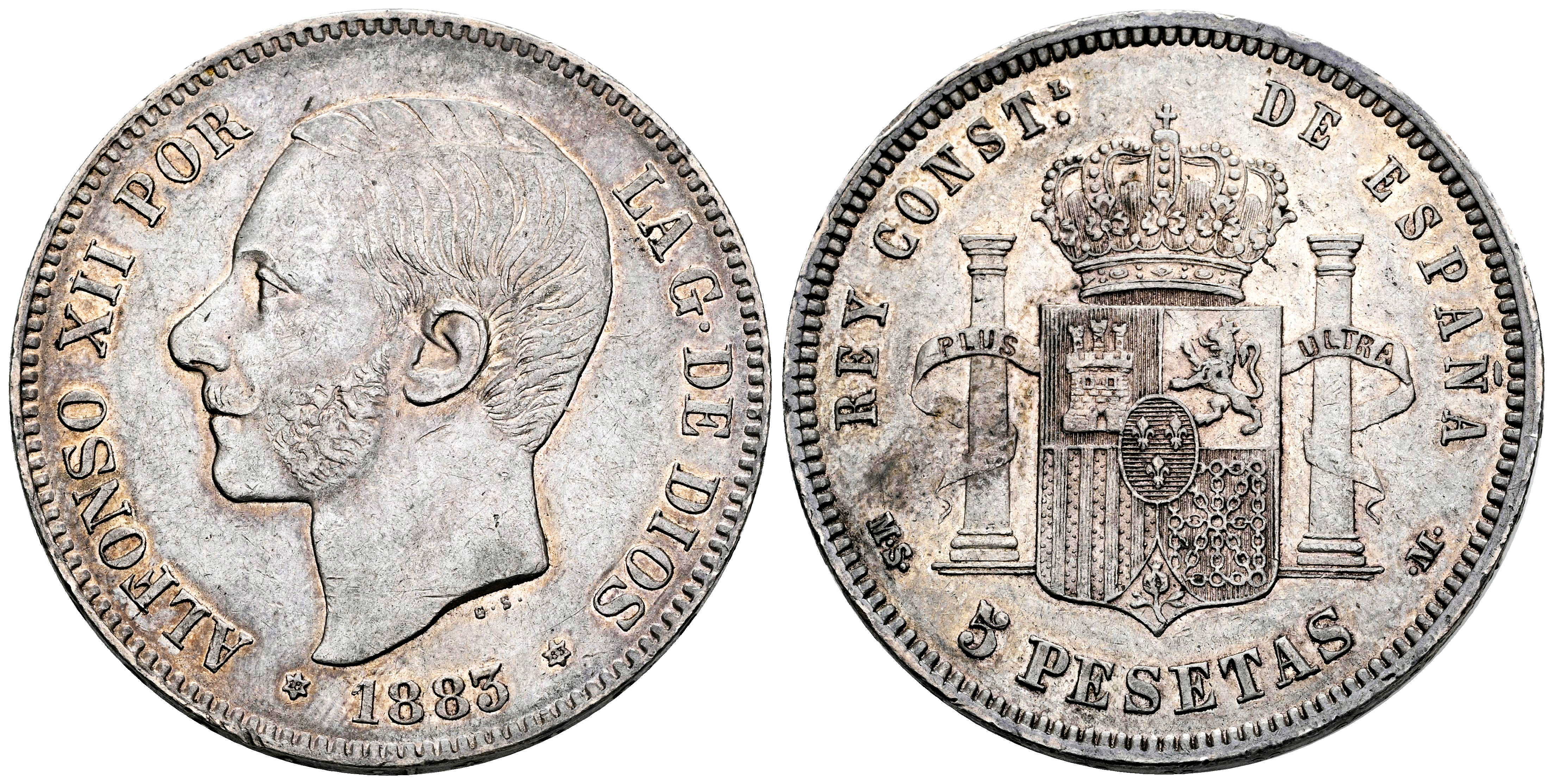 Centenario de la Peseta (1868-1931). Alfonso XII (1874-1885). 5 pesetas. 1883*18-83. Madrid. MSM. (Cal-55). Ag. 24,88 g. Suave tono y restos de brillo original. MBC+/EBC-. Est...100,00.